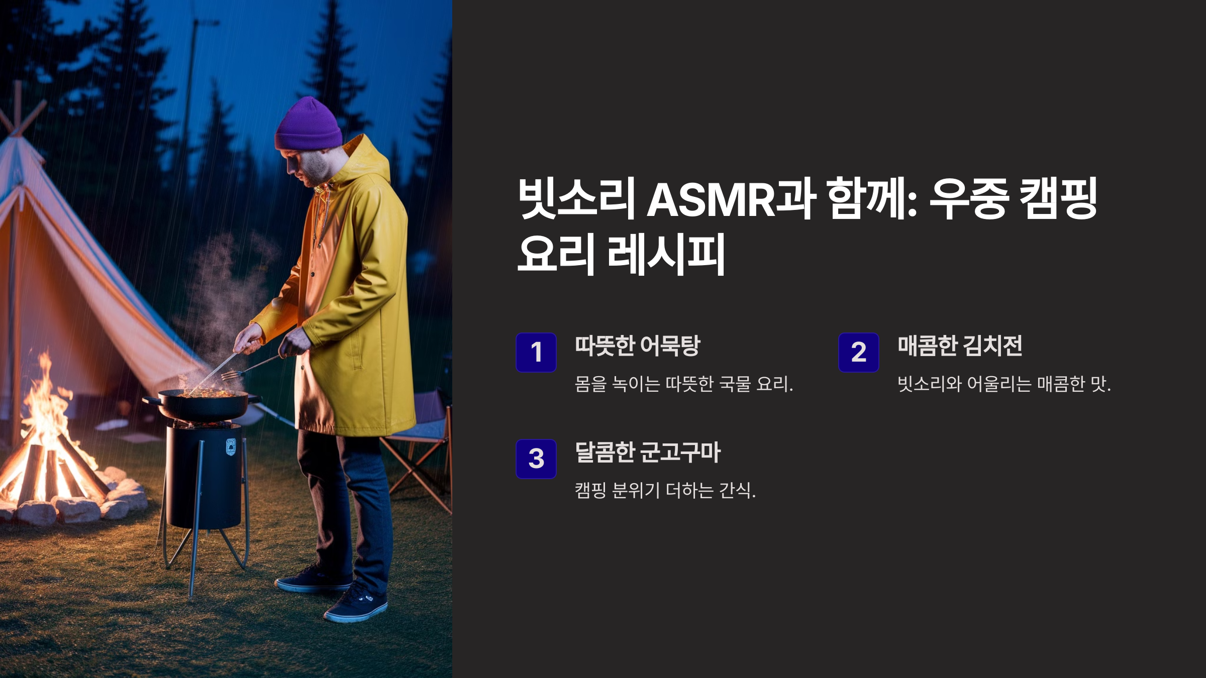 이제 텐트도 안전하게 설치했어요! 다음은 비 오는 날 더욱 특별한 캠핑 요리를 추천해볼게요. 🍲