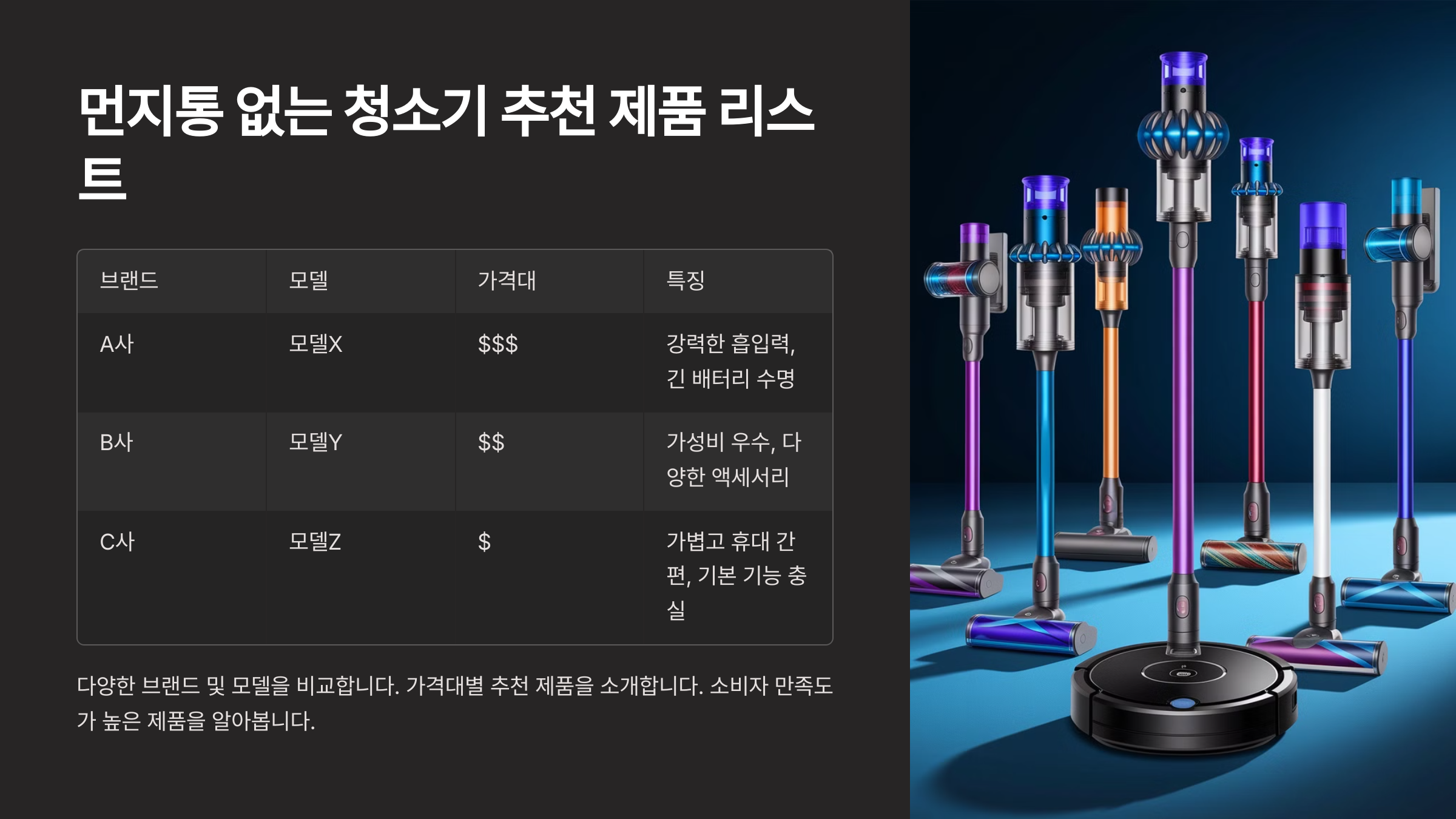 위 제품들은 성능과 사용자 리뷰를 고려해 추천하는 청소기들이에요. 자신에게 맞는 제품을 선택해 깨끗한 공간을 유지하세요! 🏡✨