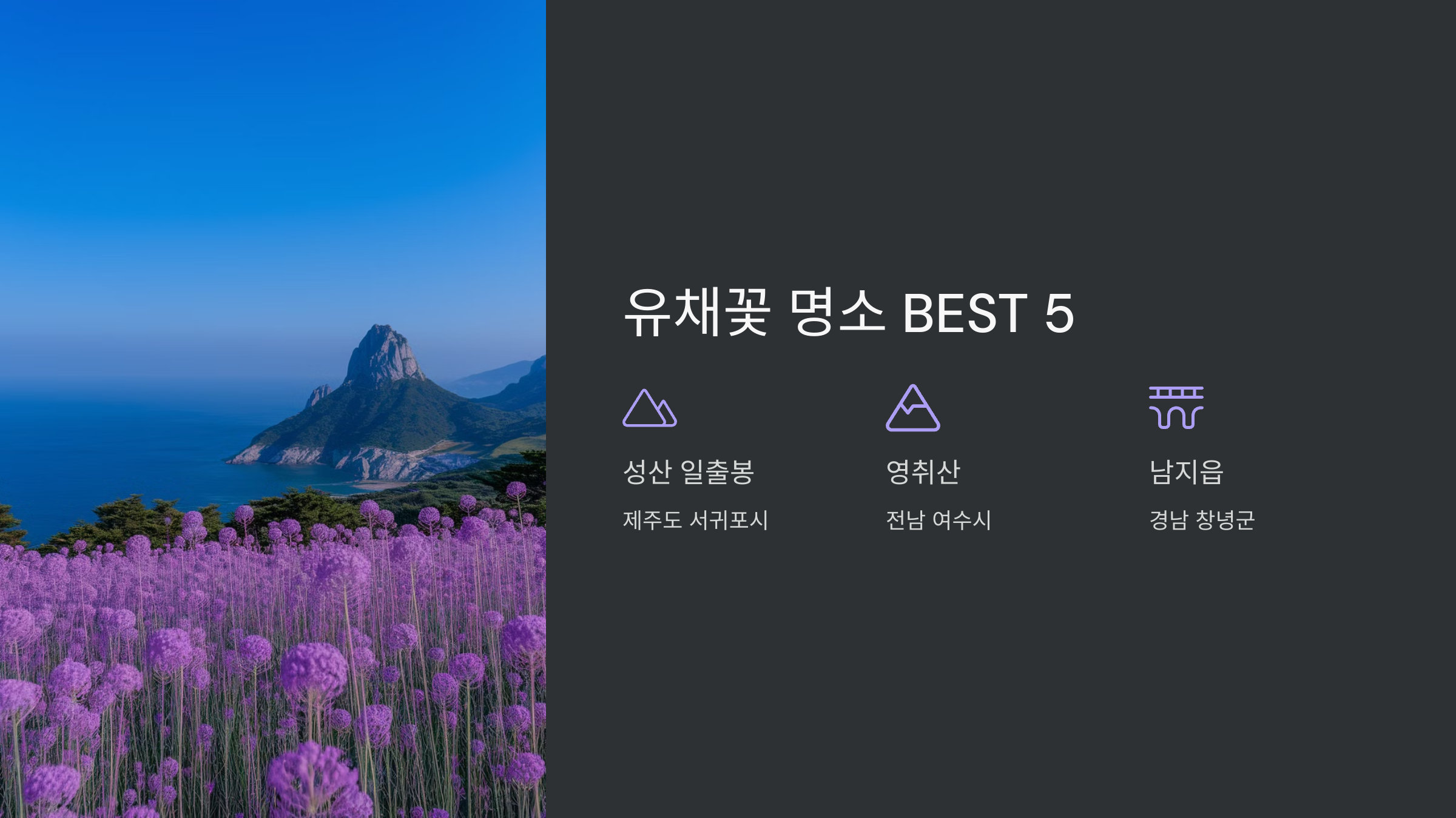국내에서 유체꽃을 볼 수 있는 대표적인 명소로는 제주도의 '녹산로'와 '유채꽃 광장', 남해의 '다랭이마을', 전라남도의 '함평 유채꽃밭' 등이 있어요. 각각의 명소마다 풍경이 조금씩 다르니, 취향에 맞게 방문하면 좋아요!