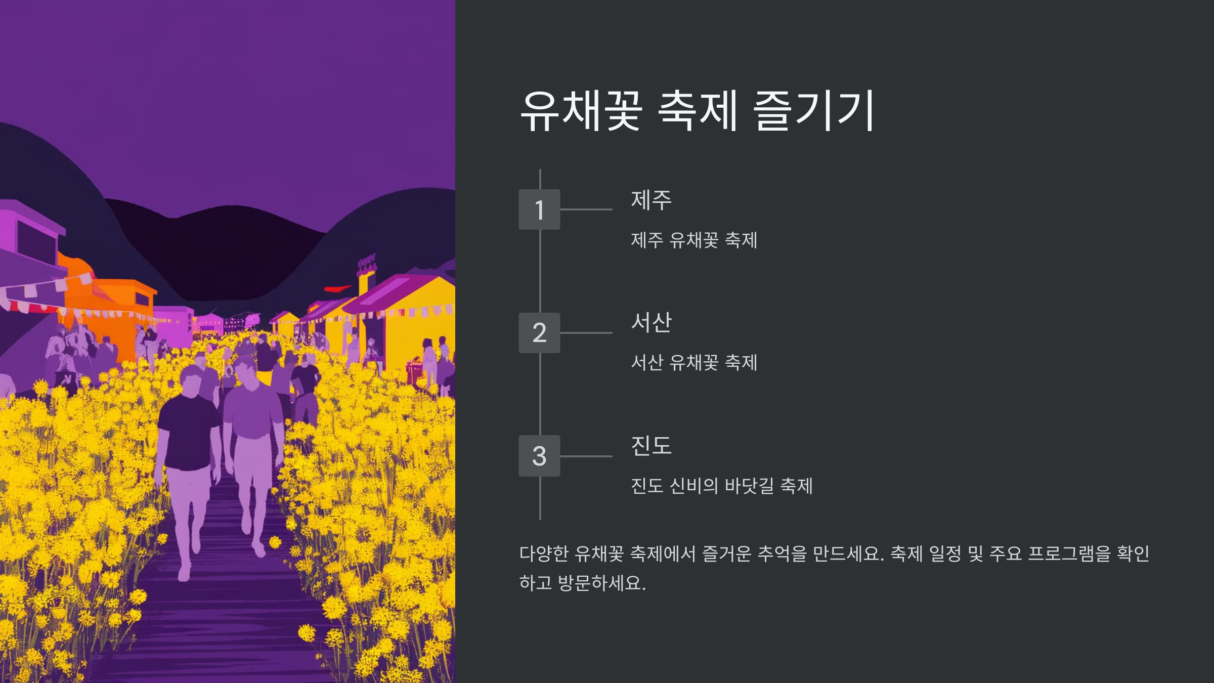특히 제주도와 부산에서는 대규모 유체꽃 축제가 열려서 많은 관광객이 몰려와요. 바람에 일렁이는 유채꽃밭을 배경으로 사진도 찍고, 지역 특산물도 맛볼 수 있어서 가족, 연인, 친구들과 함께 방문하기 좋아요.