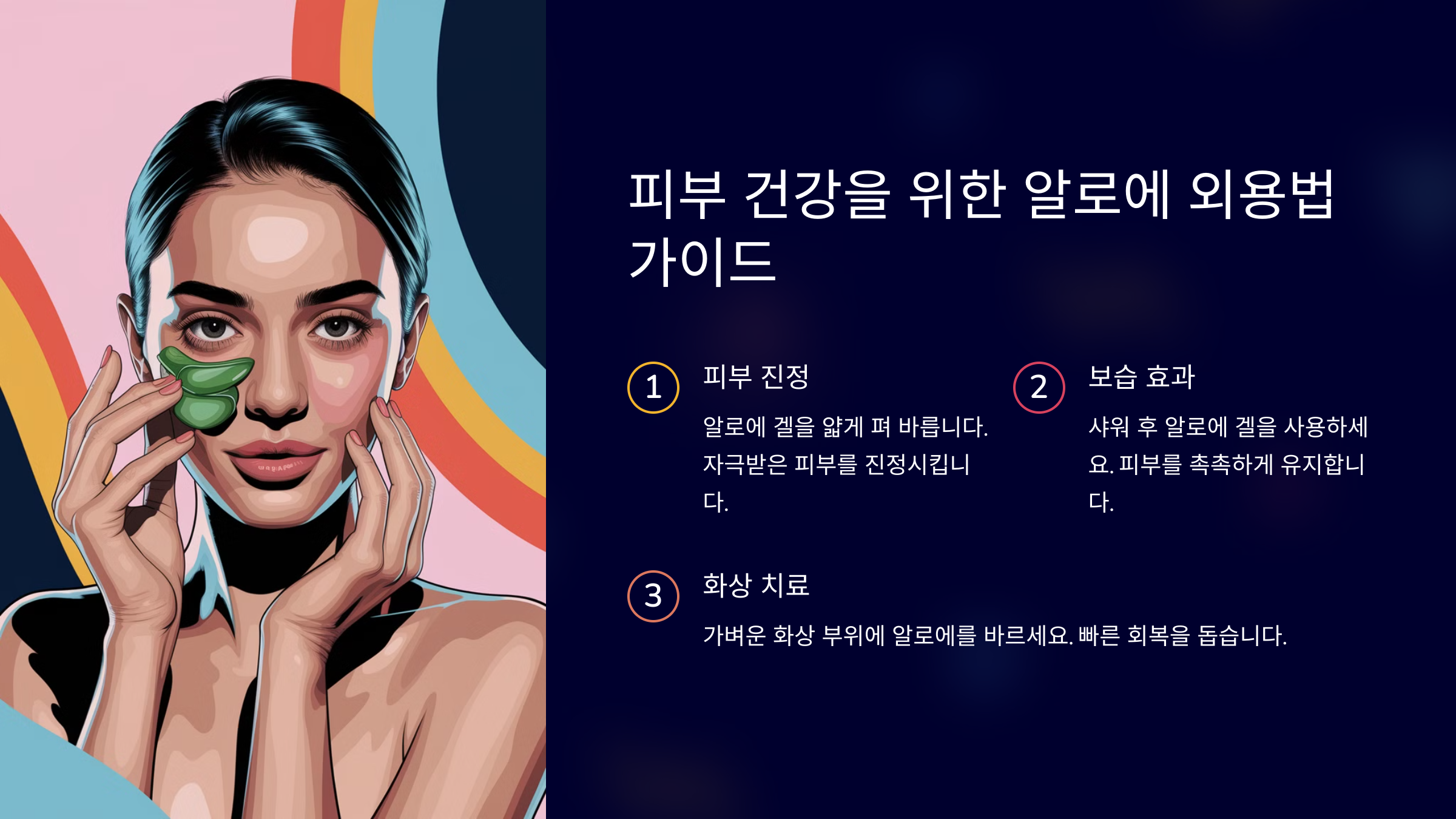 ✔ **여드름 진정**: 알로에는 항균 작용이 있어 여드름을 유발하는 박테리아를 억제해요. 세안 후 알로에 젤을 얇게 바르면 피부가 빠르게 진정돼요. 😊