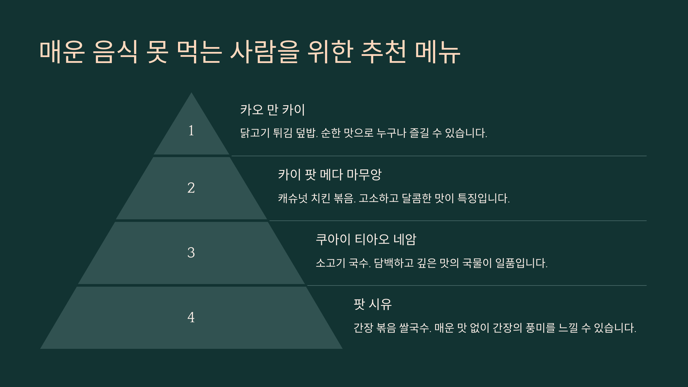 A1. 태국 음식은 매운 요리가 많지만, 맵지 않은 메뉴도 많아요. '카오만까이', '팟씨유', '똠카가이' 같은 요리는 부담 없이 즐길 수 있어요! 🌶️