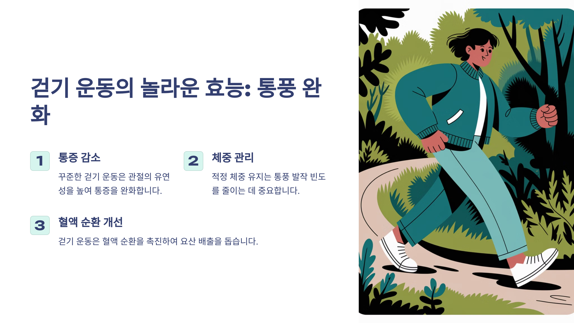 - 🩸 혈액순환 개선: 걸으면 혈액순환이 활발해져 요산이 관절에 쌓이는 것을 방지할 수 있어요.