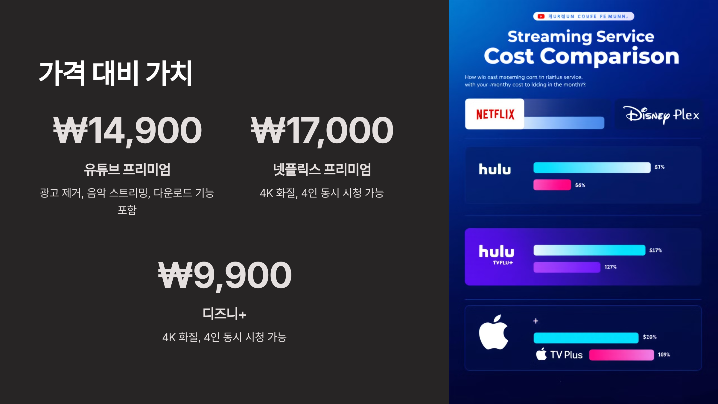 넷플릭스나 디즈니+는 기본적으로 영상 스트리밍만 제공하지만, 유튜브 프리미엄은 영상뿐만 아니라 음악까지 포함된다는 점에서 가성비가 뛰어나요. 특히 유튜브 영상을 많이 보는 사람이라면 광고 없이 시청하는 것만으로도 충분한 가치가 있죠.