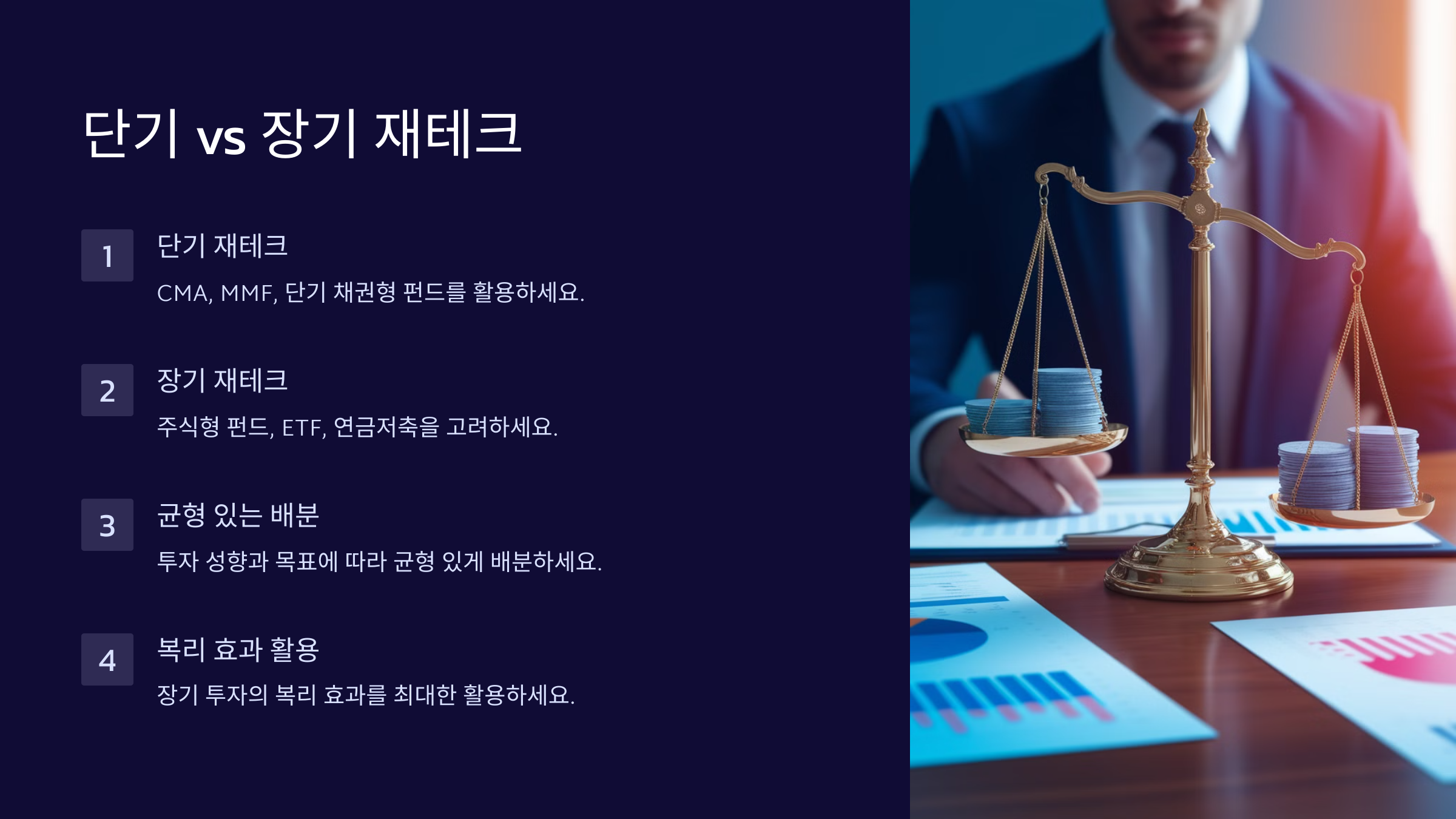 재테크를 할 때 단기와 장기를 적절히 섞는 것이 중요해요. 단기적으로 필요한 자금은 안전한 방법으로 불리고, 장기적으로는 복리 효과를 노려야 해요.