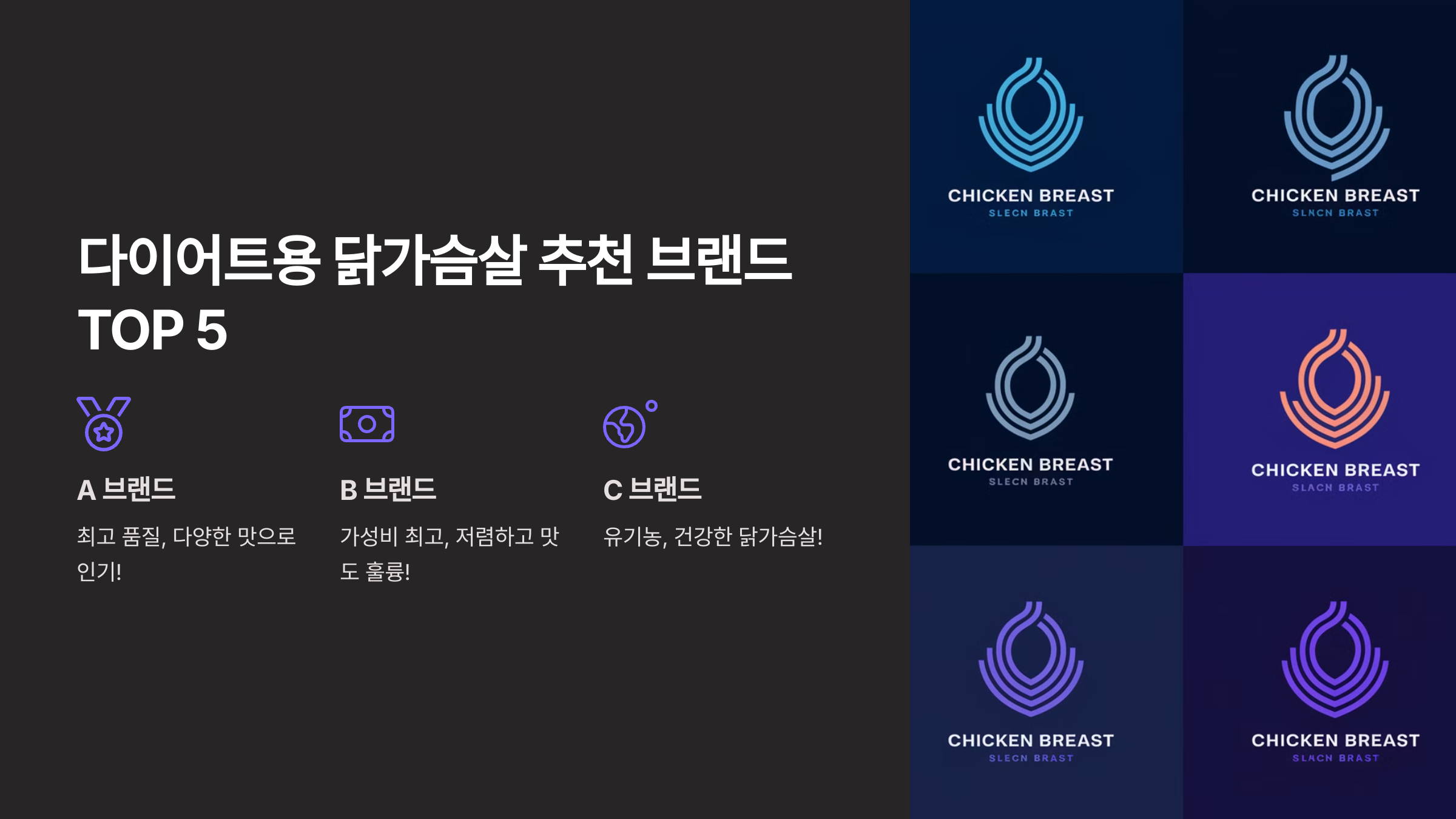 이제 다이어트하는 사람들이 많이 찾는 닭가슴살 브랜드 TOP 5를 소개할게요. 이 브랜드들은 맛도 좋고, 단백질 함량도 높아서 인기 있는 제품들이에요.