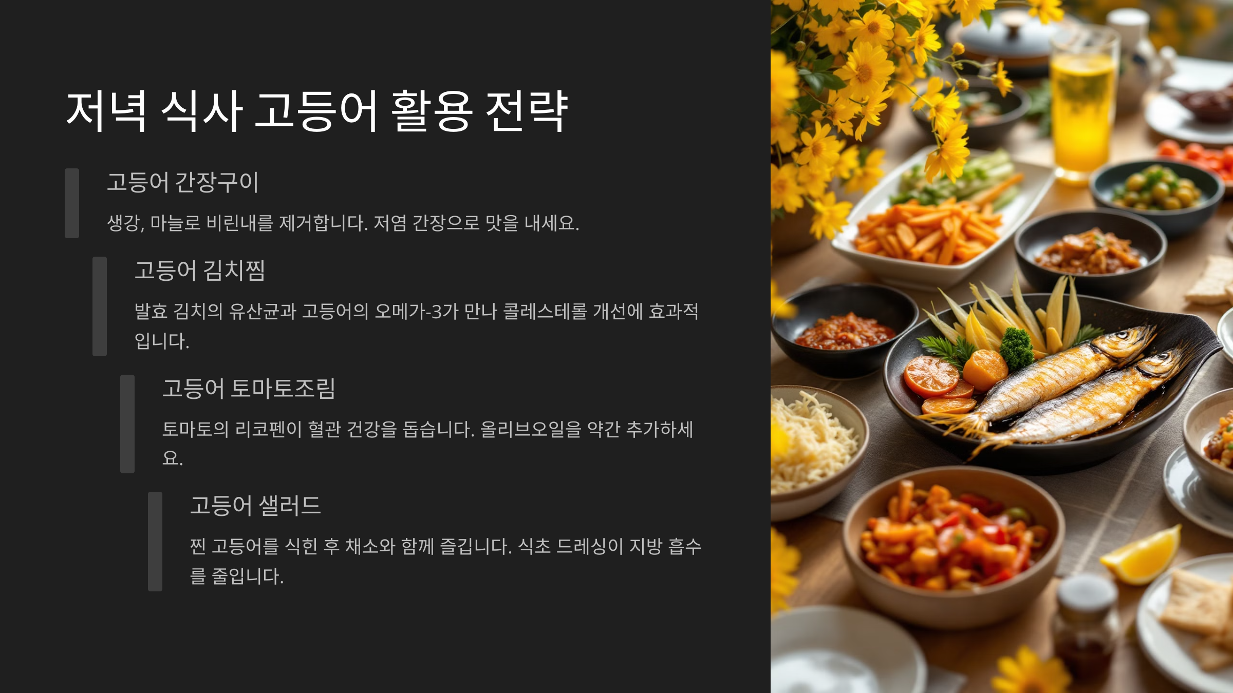 주의할 점은 밤 10시 이후엔 먹지 않는 게 좋아요. 아무리 고등어가 좋아도 늦은 야식은 LDL 수치에 악영향을 줄 수 있으니까요.