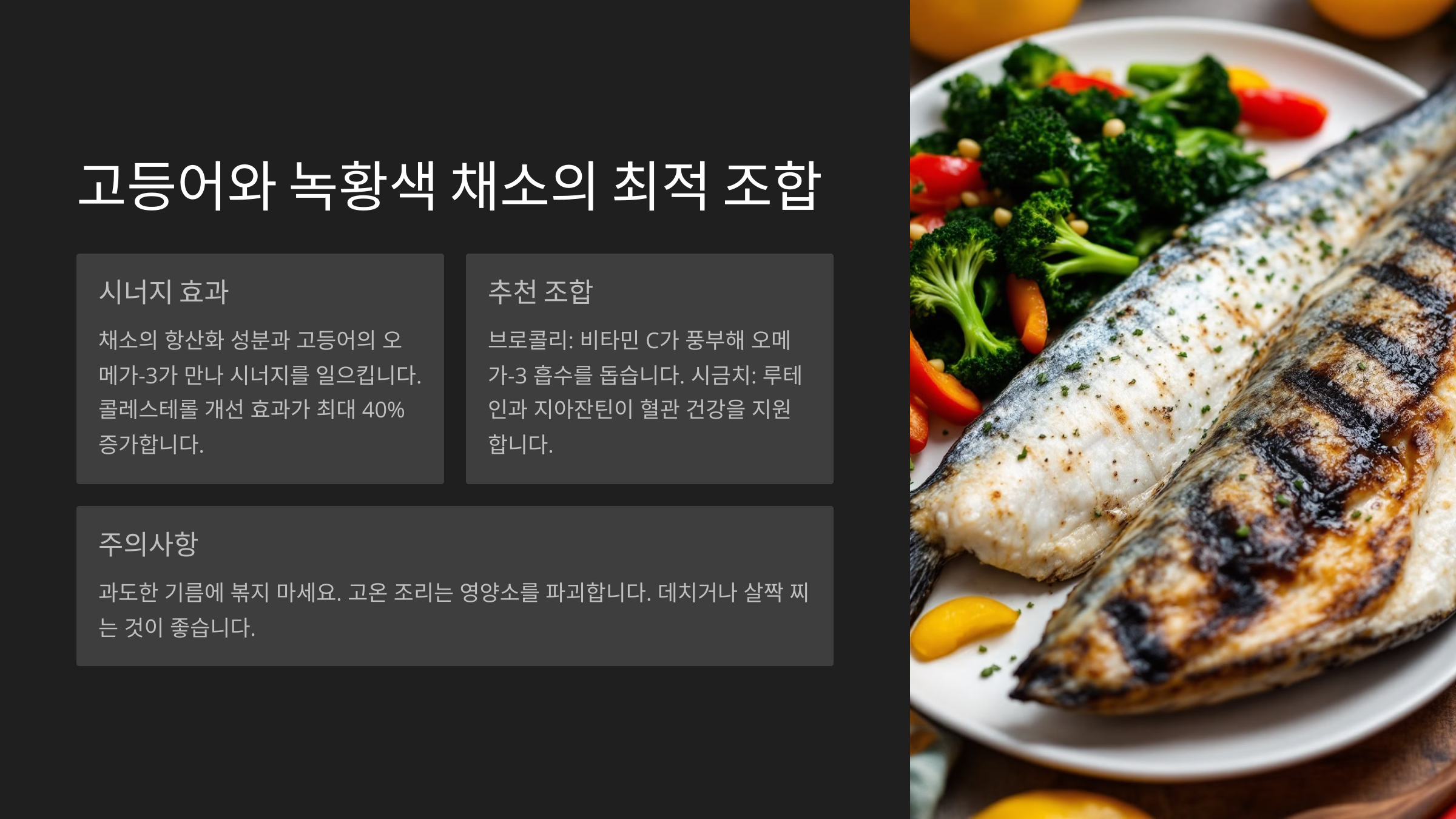 고등어는 단독으로도 훌륭하지만, 녹황색 채소와 함께 먹으면 LDL 콜레스테롤 관리에 훨씬 더 큰 시너지를 줄 수 있어요.