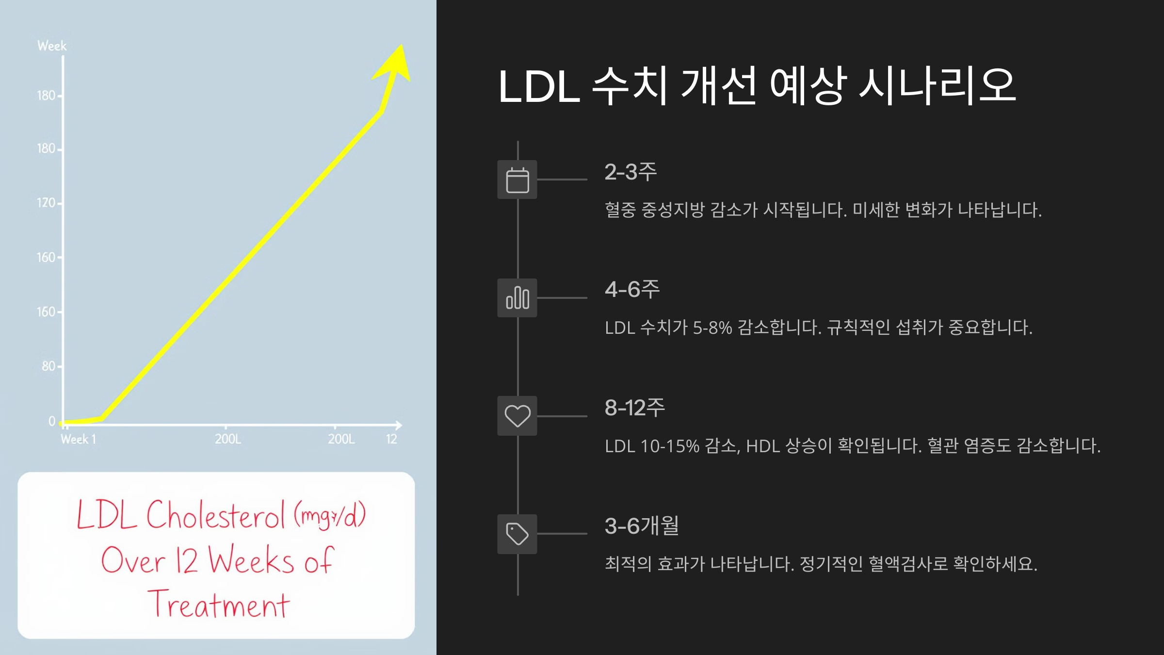 | 4~6주 | LDL 수치 5~13% 감소 |