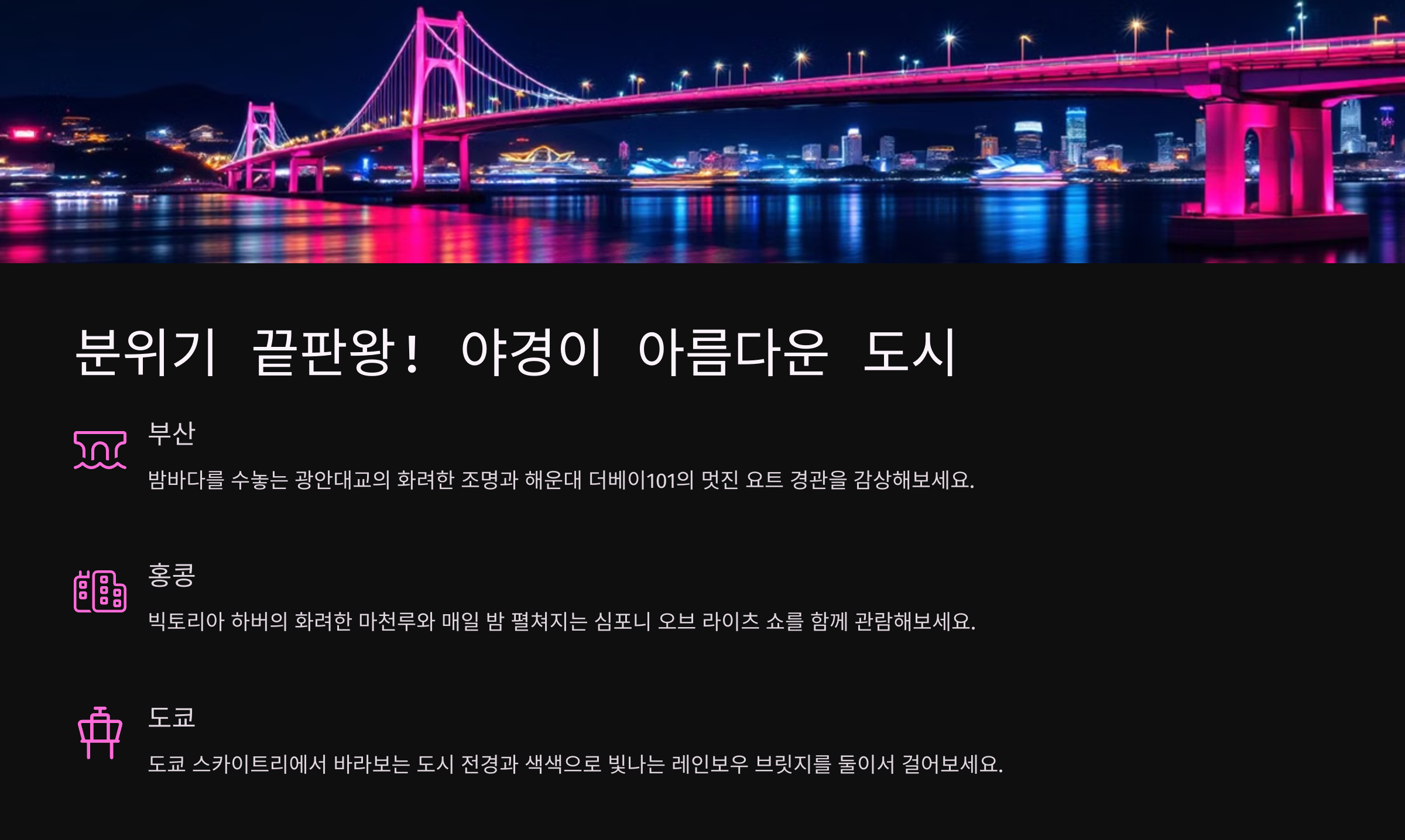 "야경이 아름다운 도시는 사랑이 더 깊어지는 곳!" 로맨틱한 분위기를 한층 더 끌어올려줄 야경이 아름다운 도시를 소개할게요. 멋진 야경 속에서 사랑을 속삭여보세요. 🌃✨