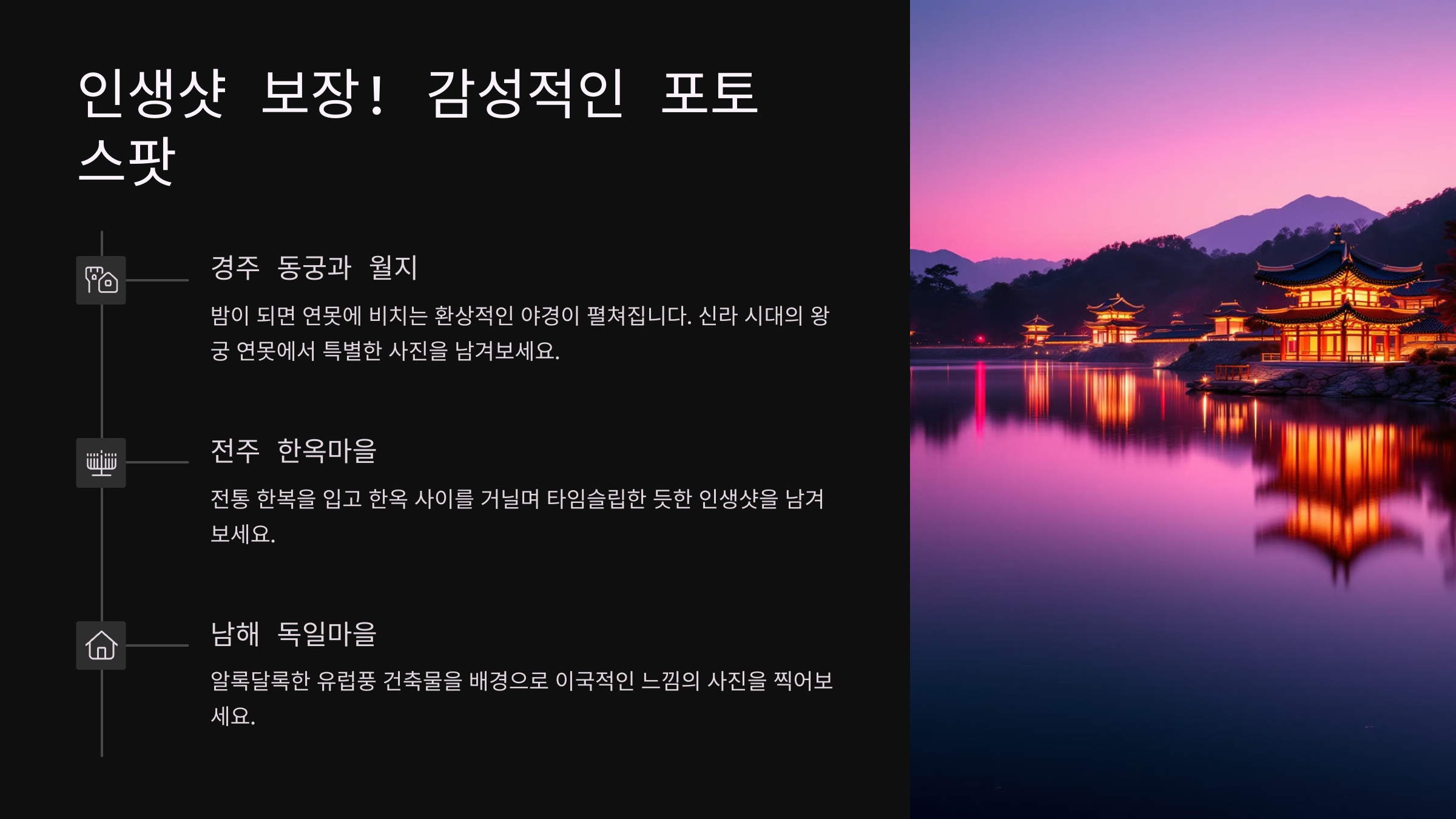 | 경주 | 한복 데이트 | 전통 한복, 고즈넉한 분위기 |