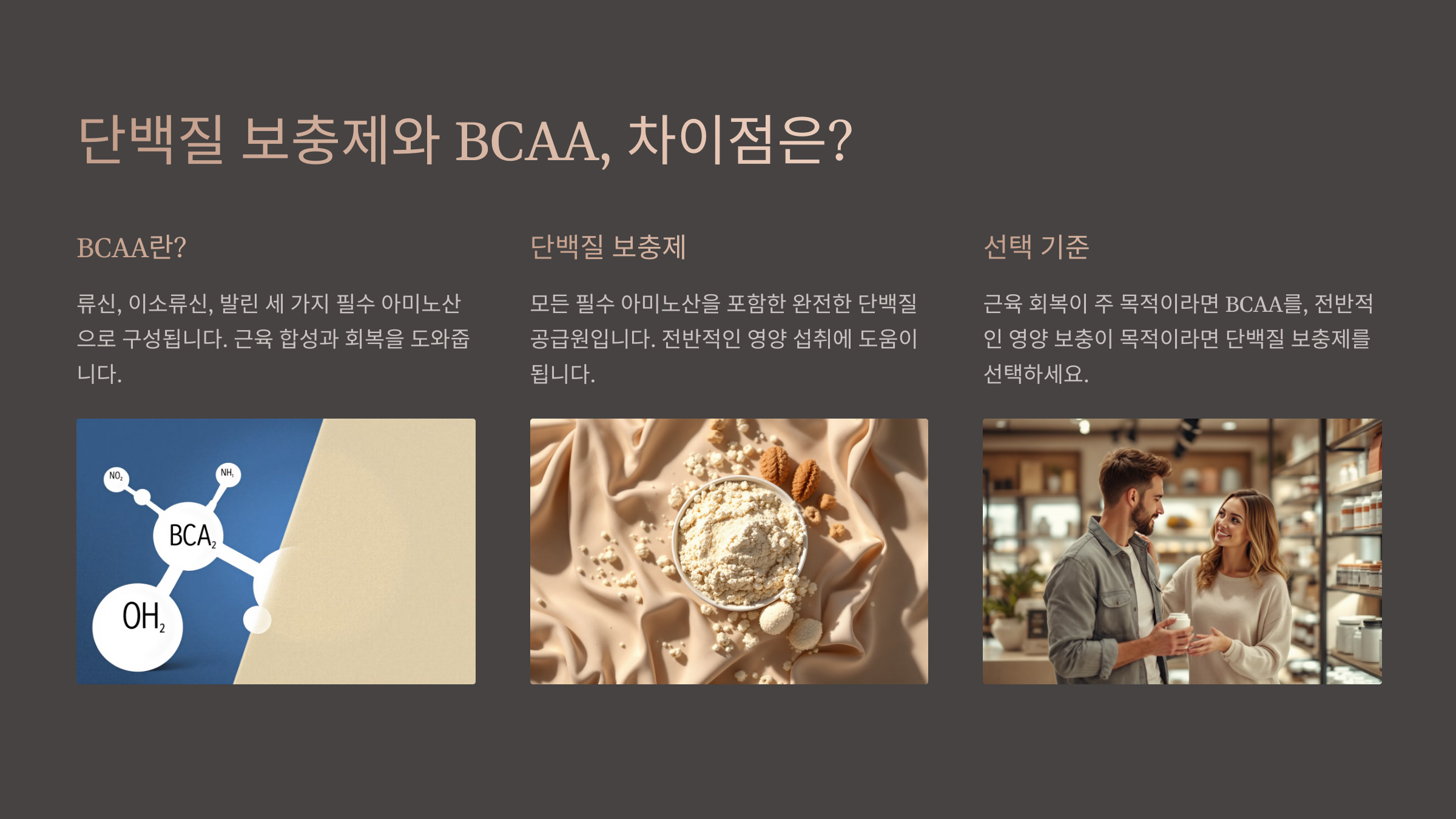 그럼 다음 섹션에서 단백질 보충제와 BCAA의 차이를 확실하게 알려드릴게요! 🚀