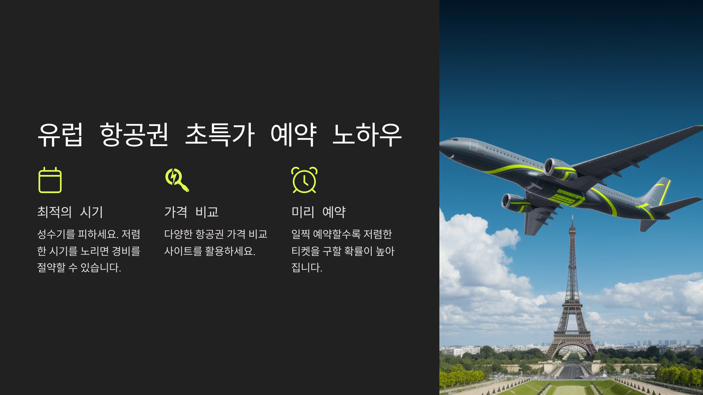 1️⃣ **성수기 피하기** - 7~8월 여름휴가 시즌과 크리스마스 연말 시즌은 항공권 가격이 치솟아요. 3~5월이나 9~11월 같은 **비수기**를 노리면 훨씬 저렴해요!