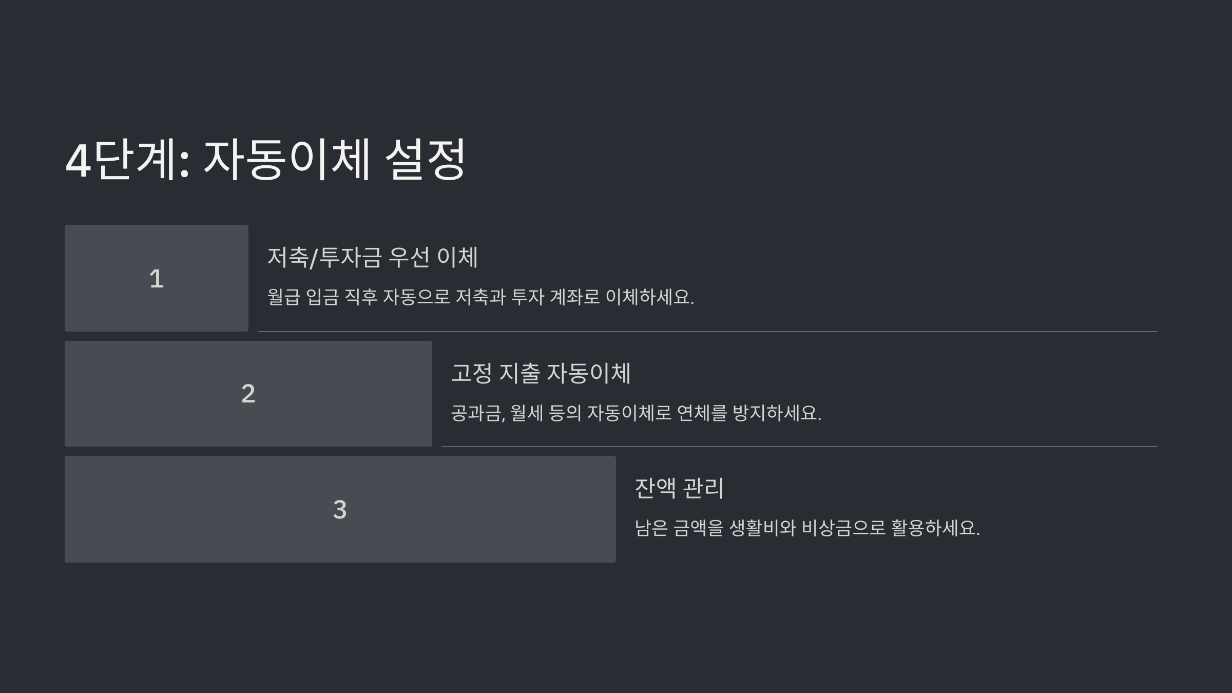 | 월급 관리 | 월급 자동 분산 (저축, 투자, 생활비) | 월급 받자마자 무계획 소비 |