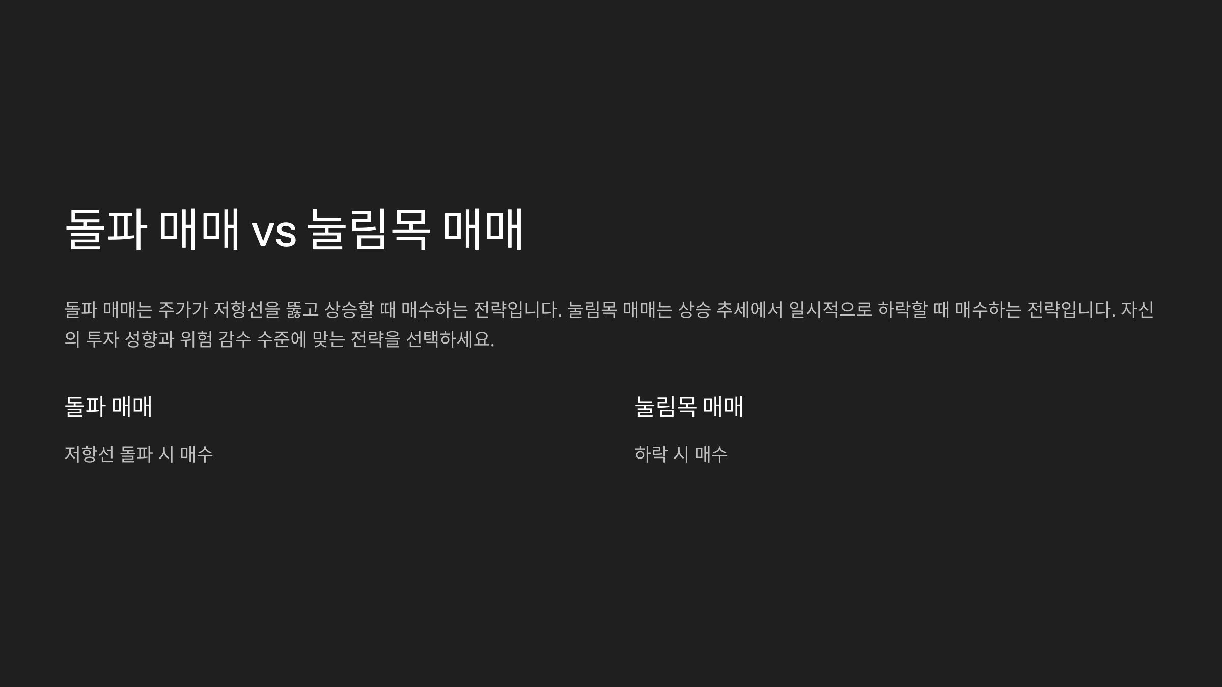 A4. 돌파 매매는 빠른 상승을 노릴 수 있지만 리스크가 커요. 눌림목 매매는 비교적 안정적이지만 상승 시점이 늦을 수 있어요.