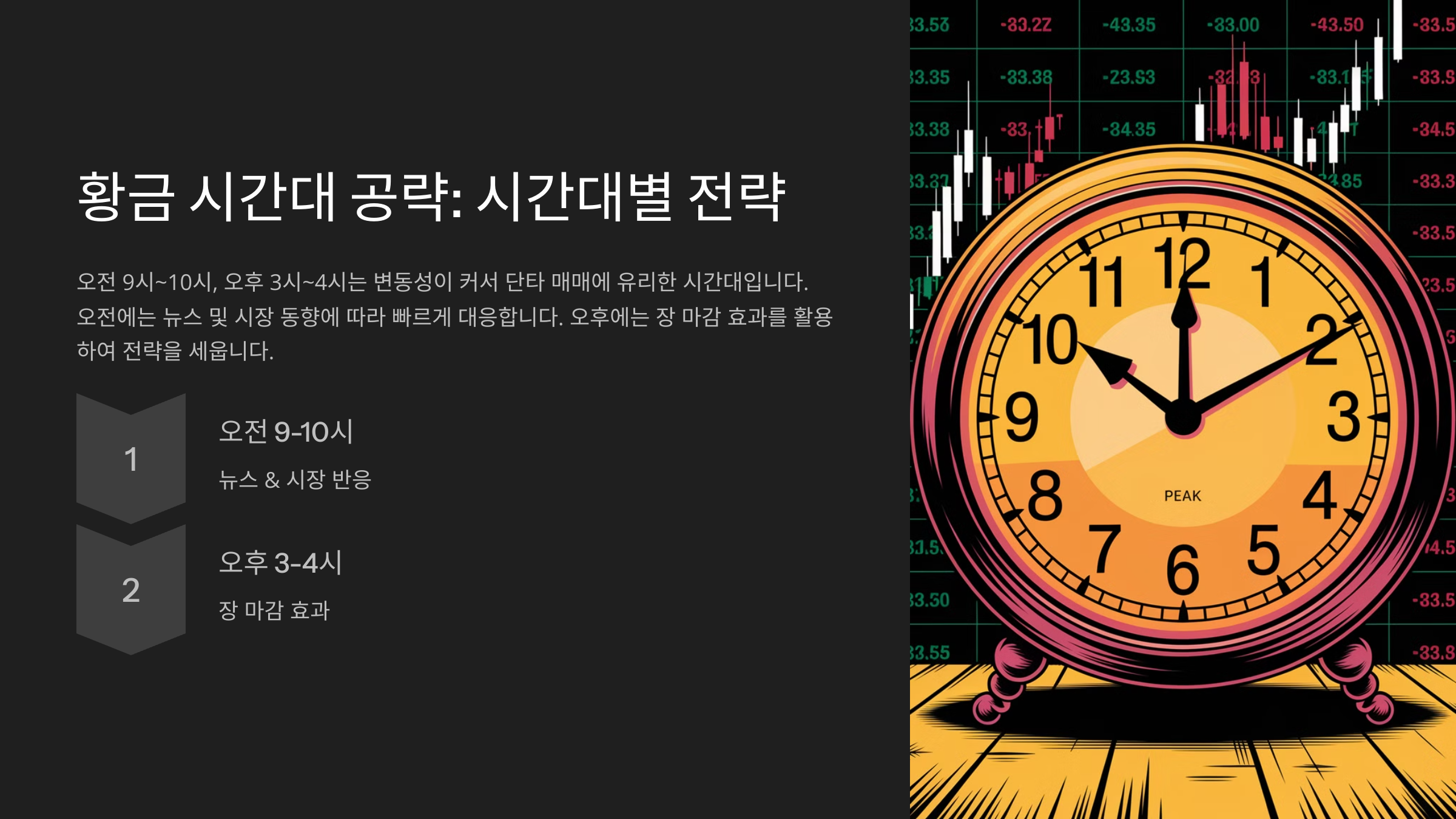 시간대별 특징을 잘 이해하고, 매매 전략을 적절히 조합하면 보다 안정적인 단타 매매가 가능해요! 📊