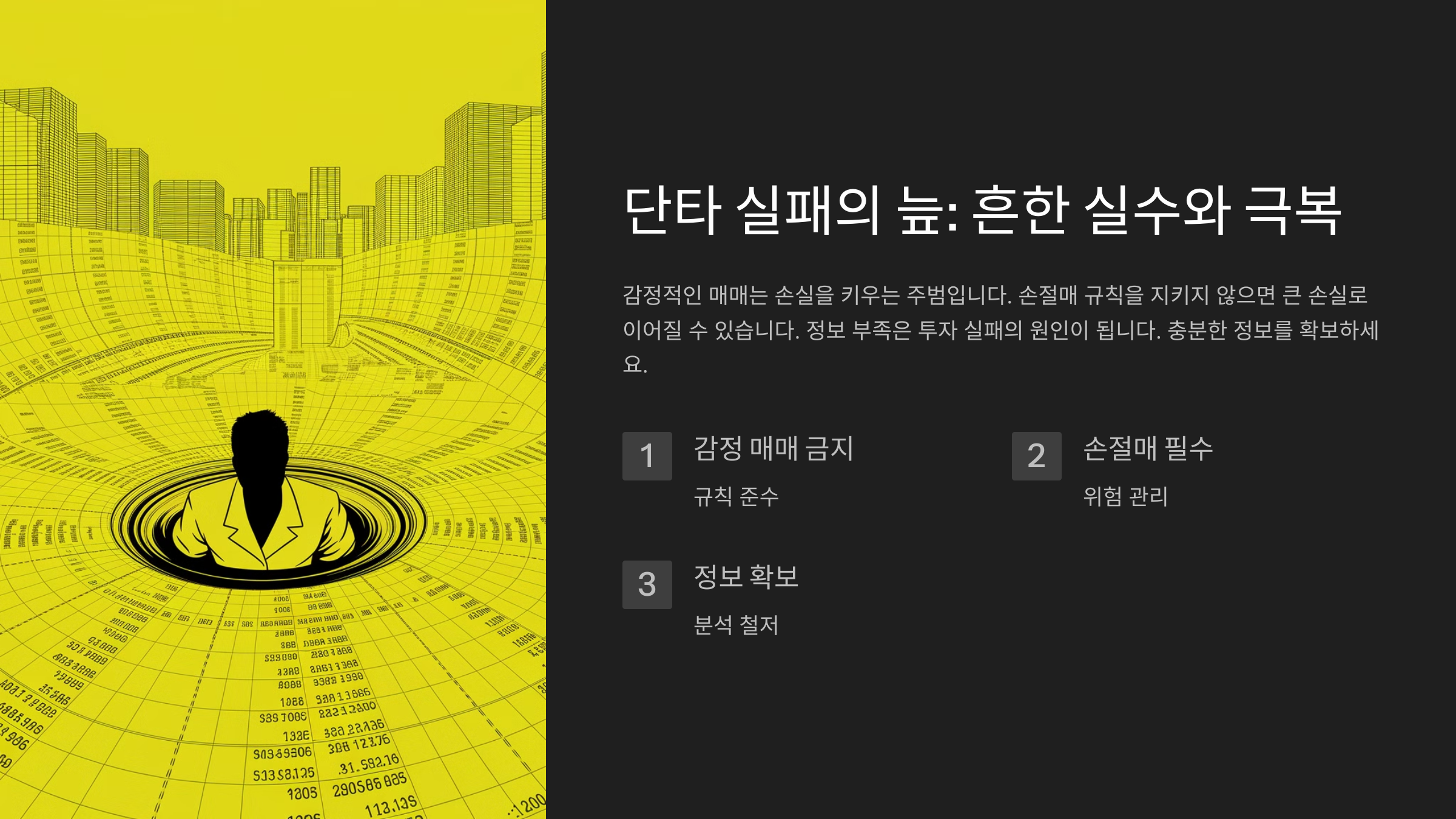**감정적인 매매**도 피해야 해요. 손실을 빠르게 만회하려는 조급함은 오히려 더 큰 손실을 초래할 수 있어요. 냉정하게 매매 계획을 세우고, 그 계획을 철저히 따르는 것이 중요해요. 🎯