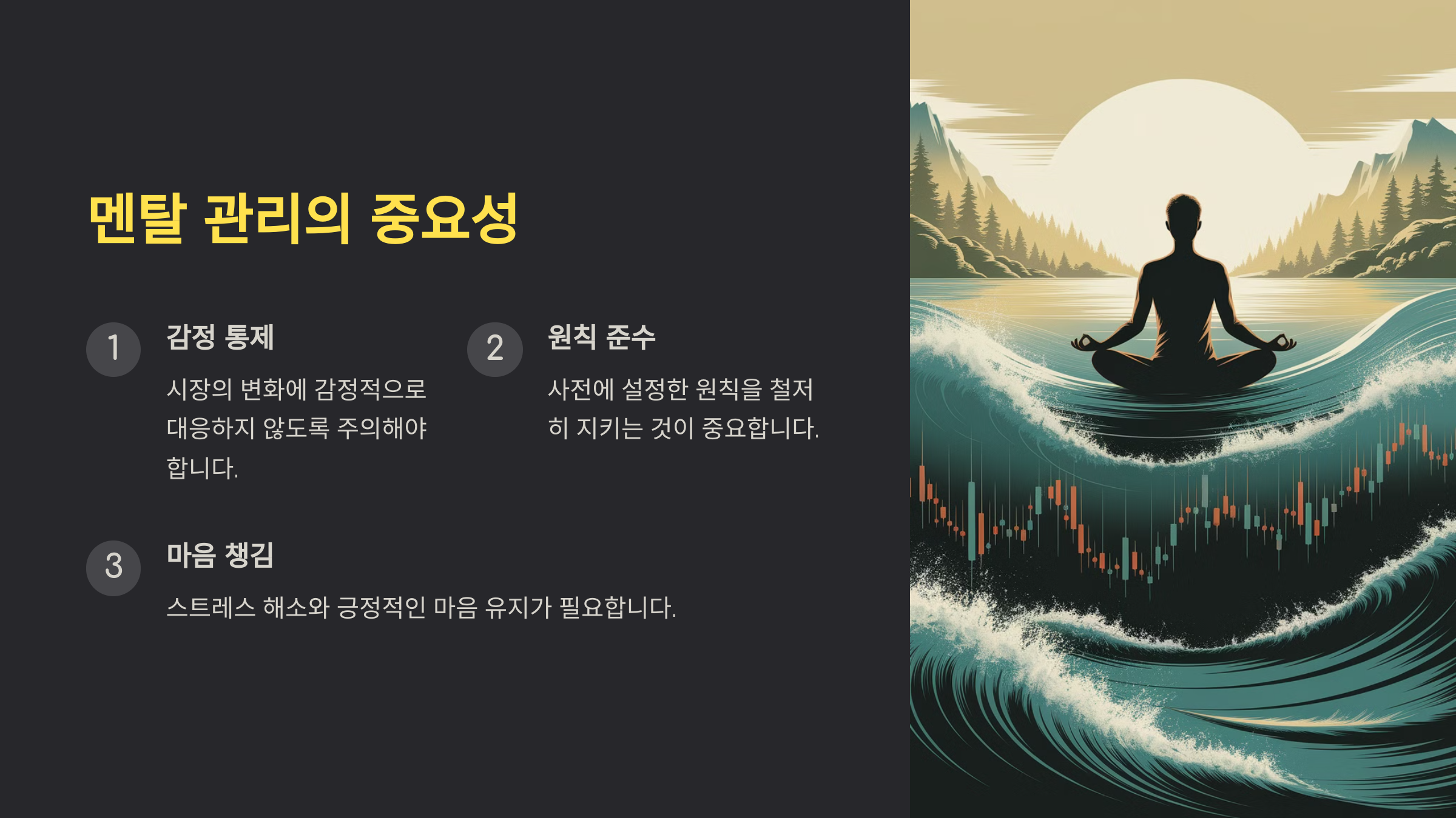 단타 매매에서 가장 중요한 것은 멘탈 관리예요. 단기적인 수익과 손실에 흔들리지 않는 것이 핵심이죠. 감정적인 매매를 하면 손실이 커질 가능성이 높아요. 따라서 자신만의 매매 원칙을 세우고, 냉정한 판단을 유지하는 것이 중요해요.