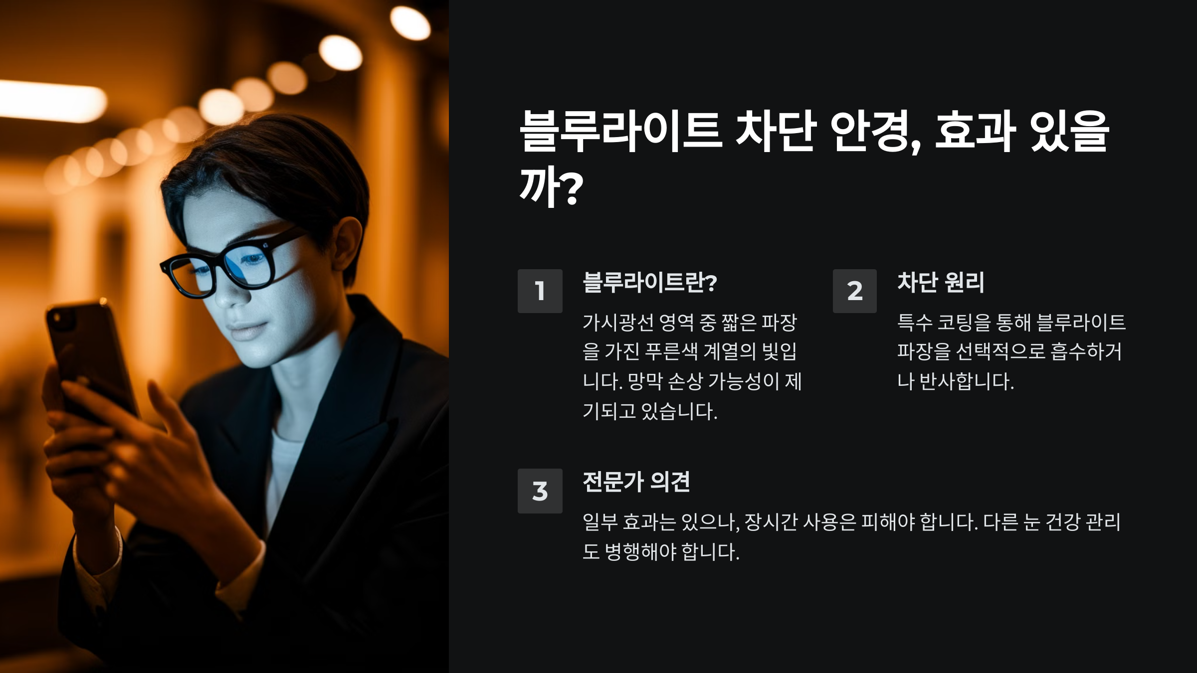 스마트폰과 컴퓨터에서 나오는 블루라이트(청색광)는 눈 건강에 영향을 줄 수 있어요. 블루라이트는 짧은 파장의 강한 에너지를 가지고 있어 망막에 부담을 줄 가능성이 있어요. 그래서 많은 사람들이 블루라이트 차단 안경을 착용하면 눈의 피로를 줄이고, 노안을 예방할 수 있다고 생각하죠.