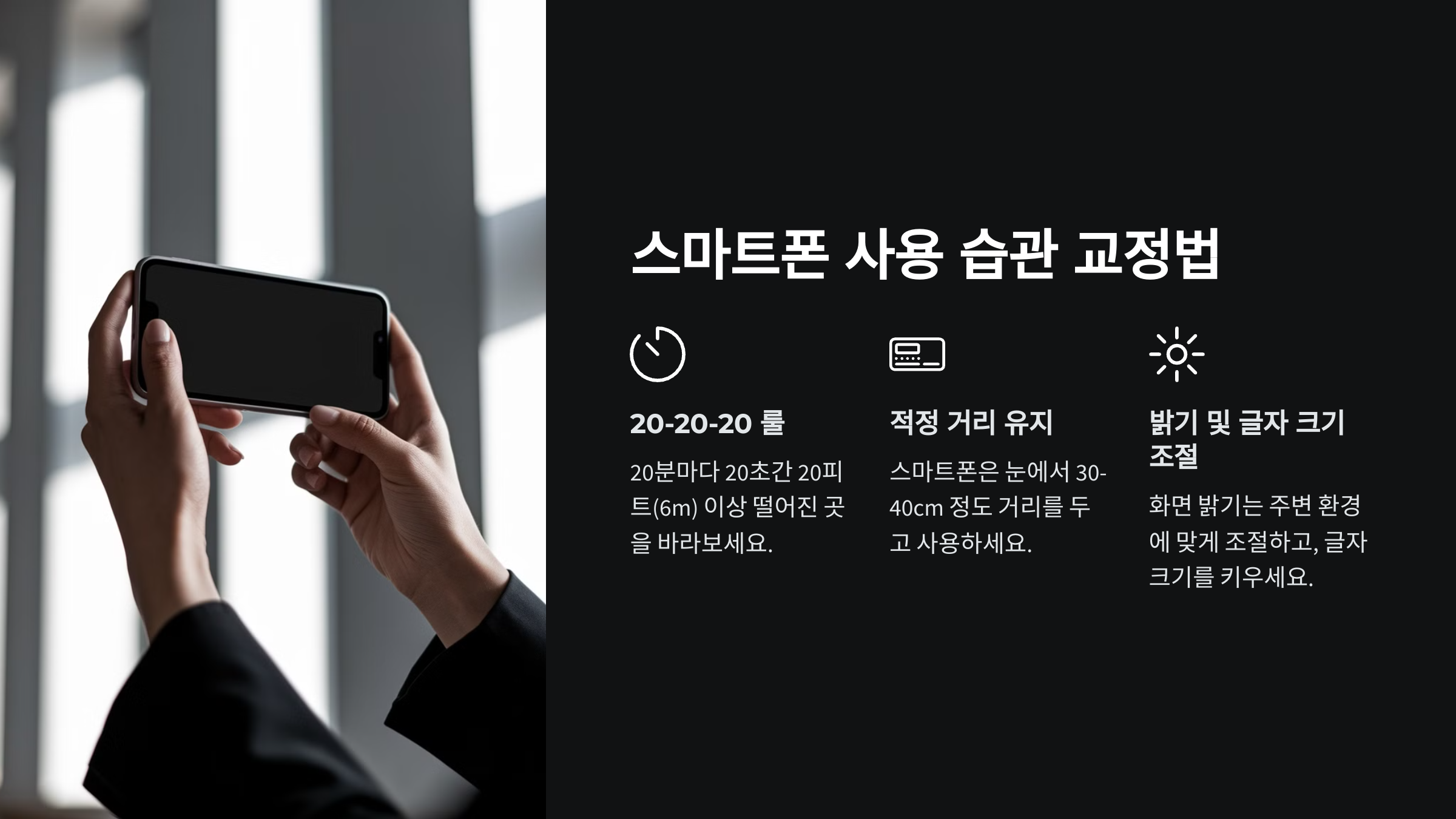 또한, 스마트폰을 사용할 때 20-20-20 규칙을 실천하는 것이 좋아요. 20분마다 20초 동안 20피트(약 6m) 거리의 물체를 바라보는 것이에요. 이 습관을 들이면 눈의 긴장을 풀어주고 피로를 줄일 수 있어요. 😊