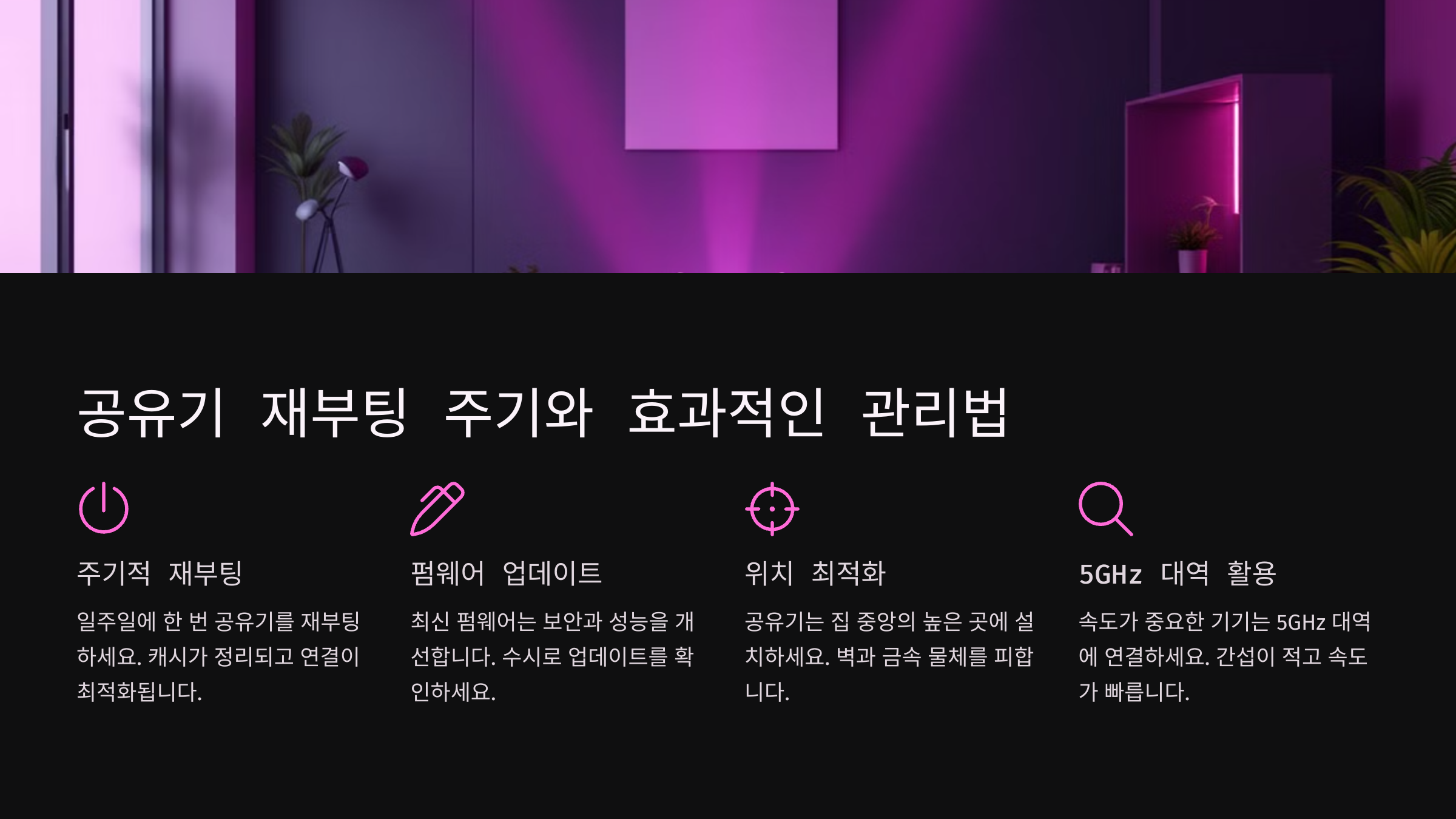 | 공유기 재부팅 | 2~3일에 한 번 | 속도 안정화, 끊김 방지 |
