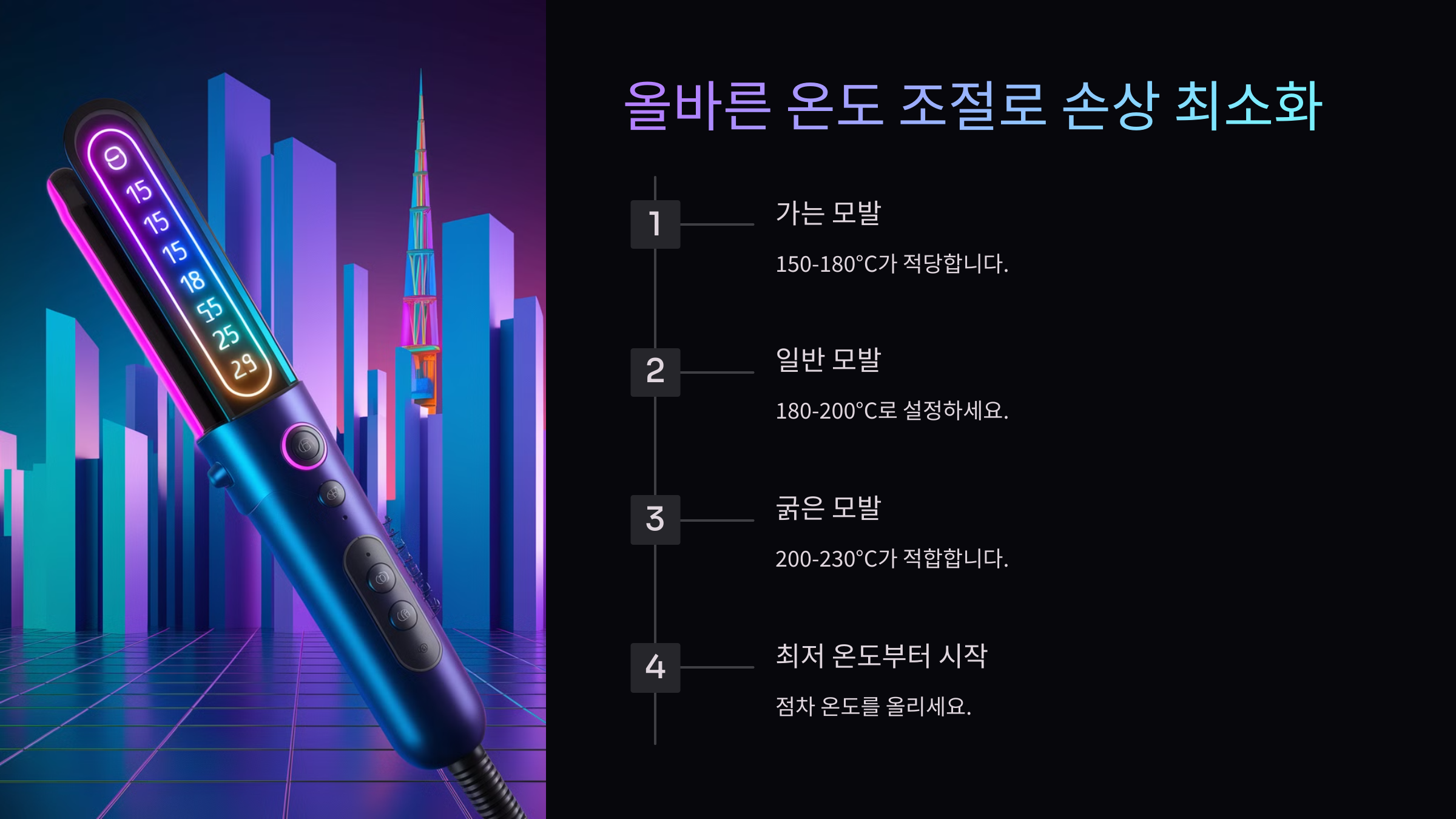 모발이 얇고 손상된 경우, 150℃ 이하에서 스타일링하는 것이 좋아요. 건강한 모발이라도 200℃를 넘기지 않는 것이 중요해요! 🌡️