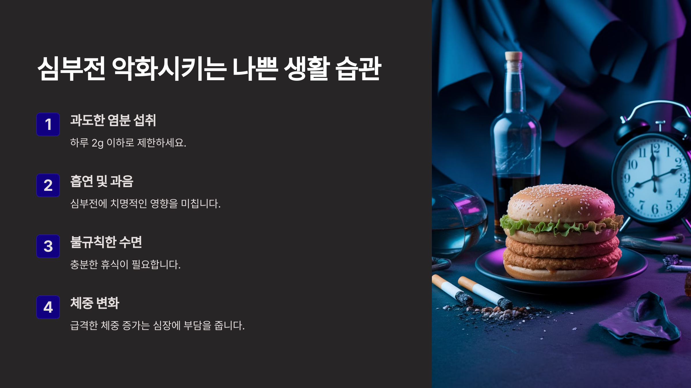 심부전 환자가 일상에서 무심코 하는 습관들이 병을 더 악화시킬 수 있어요. 특히 나트륨 과다 섭취, 수분 조절 실패, 과도한 음주와 흡연 등이 심부전에 치명적인 영향을 미친답니다.