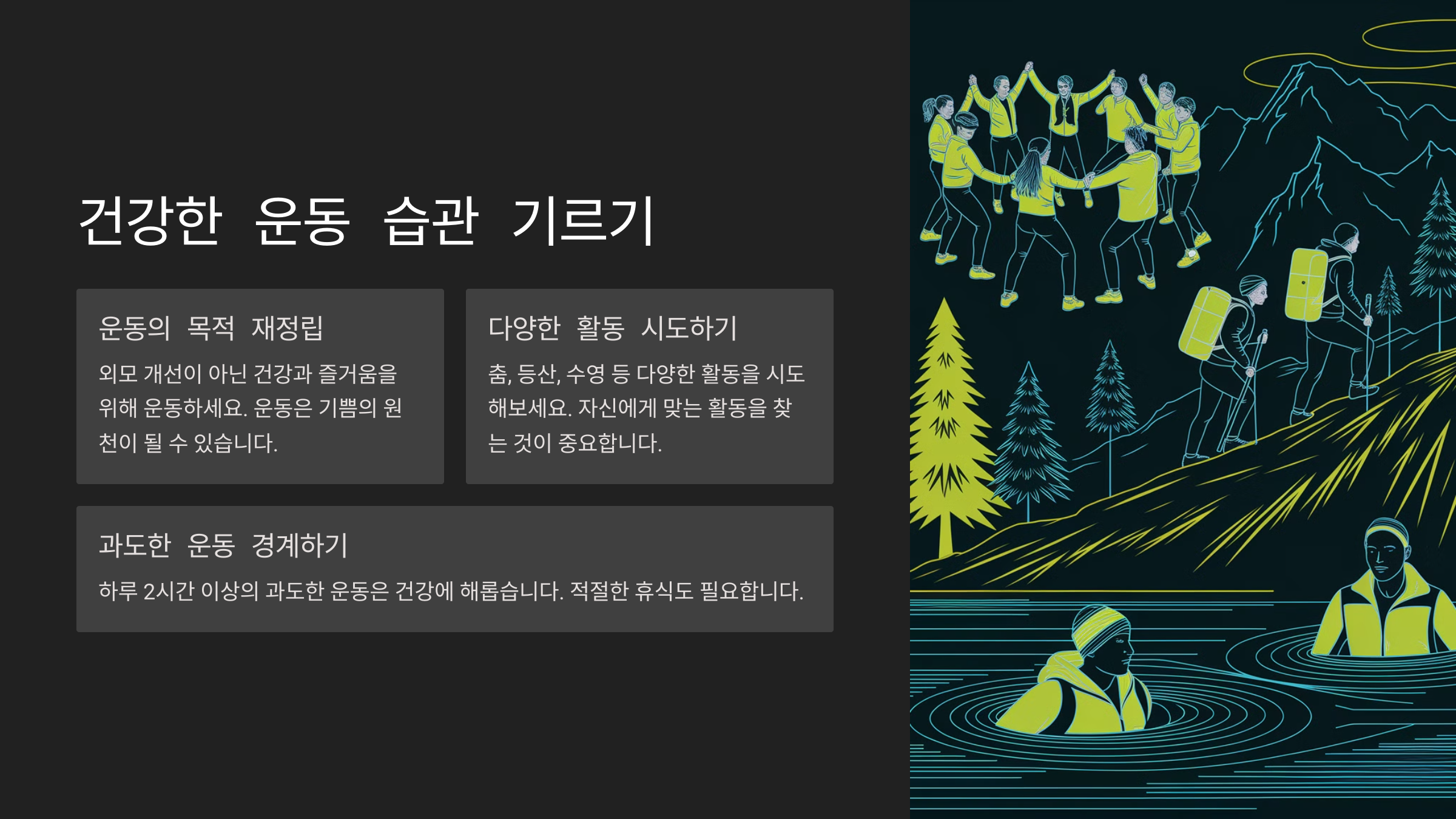 | 즐길 수 있는 운동 찾기 | 댄스, 요가, 하이킹 등 다양한 시도 |