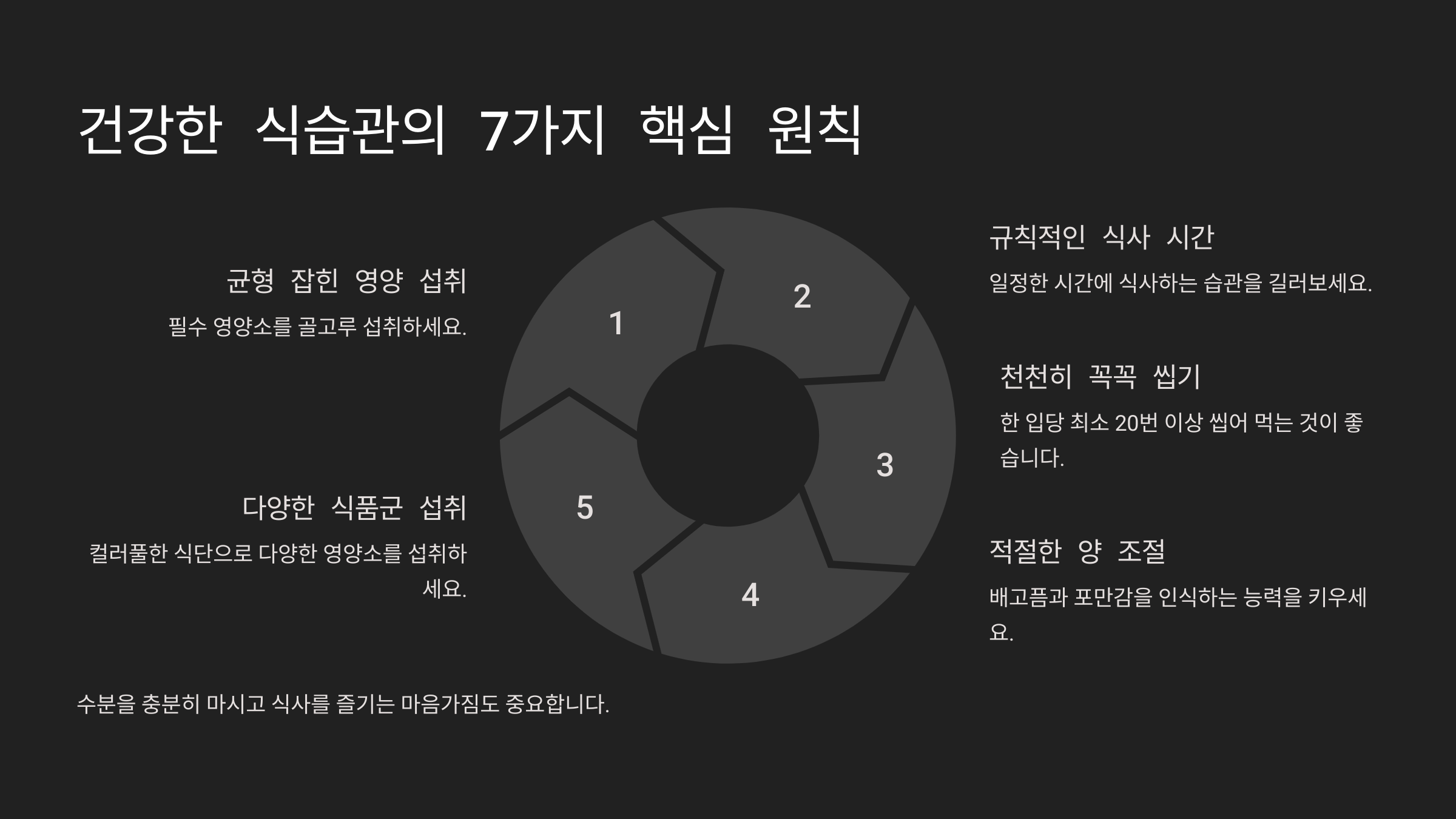 건강한 식습관은 하루아침에 만들어지는 것이 아니에요. 꾸준한 실천과 올바른 정보가 필요하죠. 다음의 7가지 원칙을 따르면 건강한 식습관을 형성하는 데 큰 도움이 될 거예요.