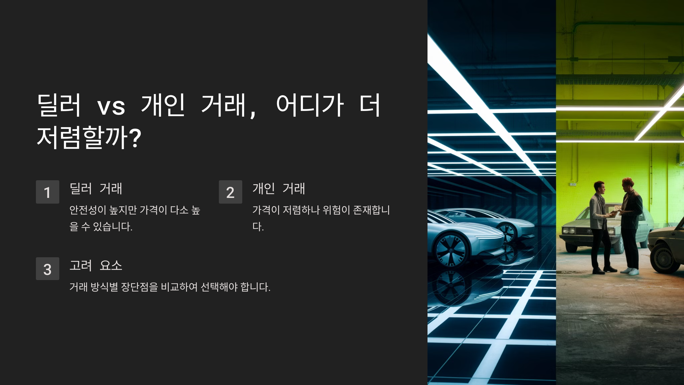 📢 결론적으로, **안전성을 원한다면 딜러 거래, 저렴한 가격을 원한다면 개인 거래**가 좋아요!