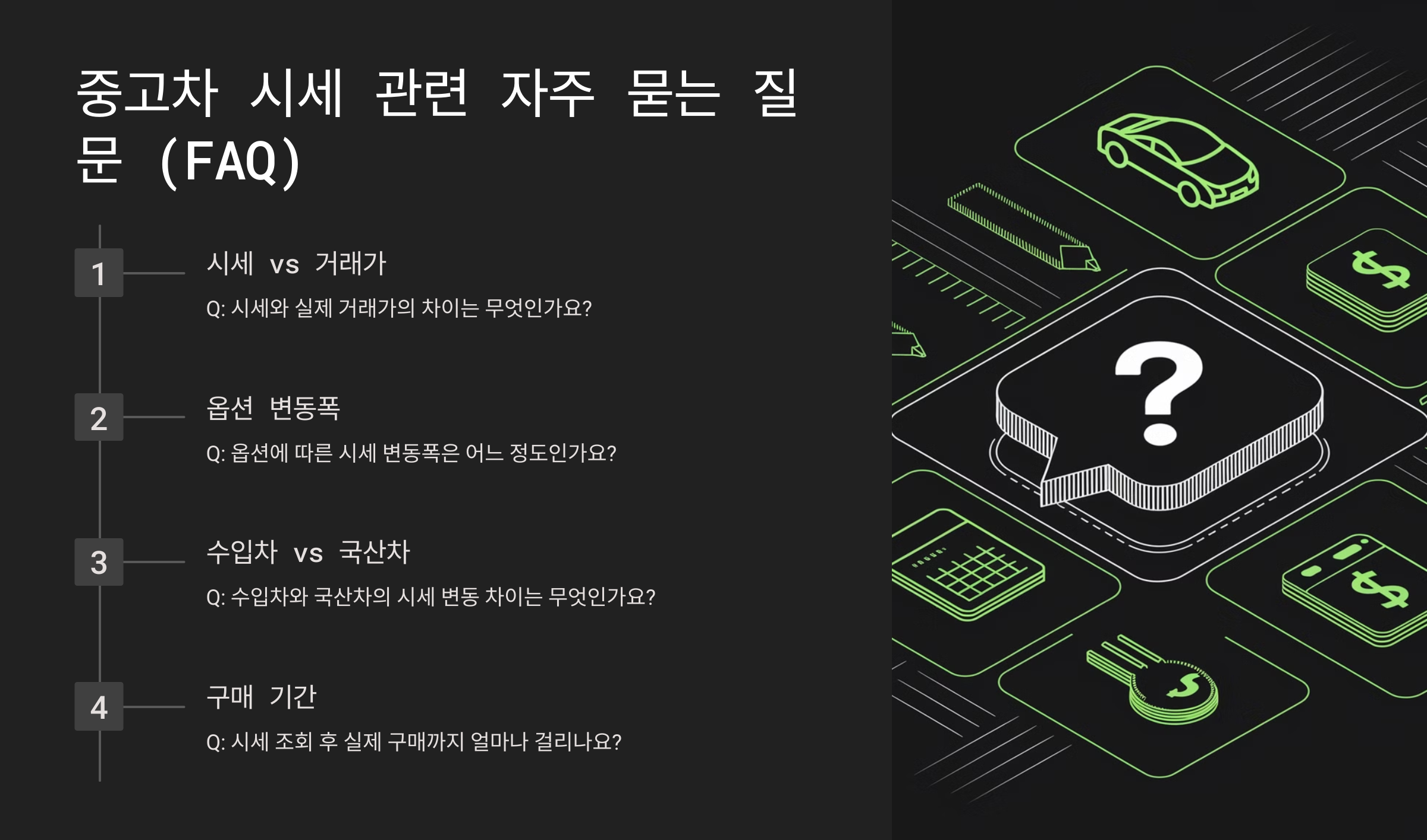 이제 **중고차 시세 관련 자주 묻는 질문(FAQ)**을 살펴볼까요? 🤔
