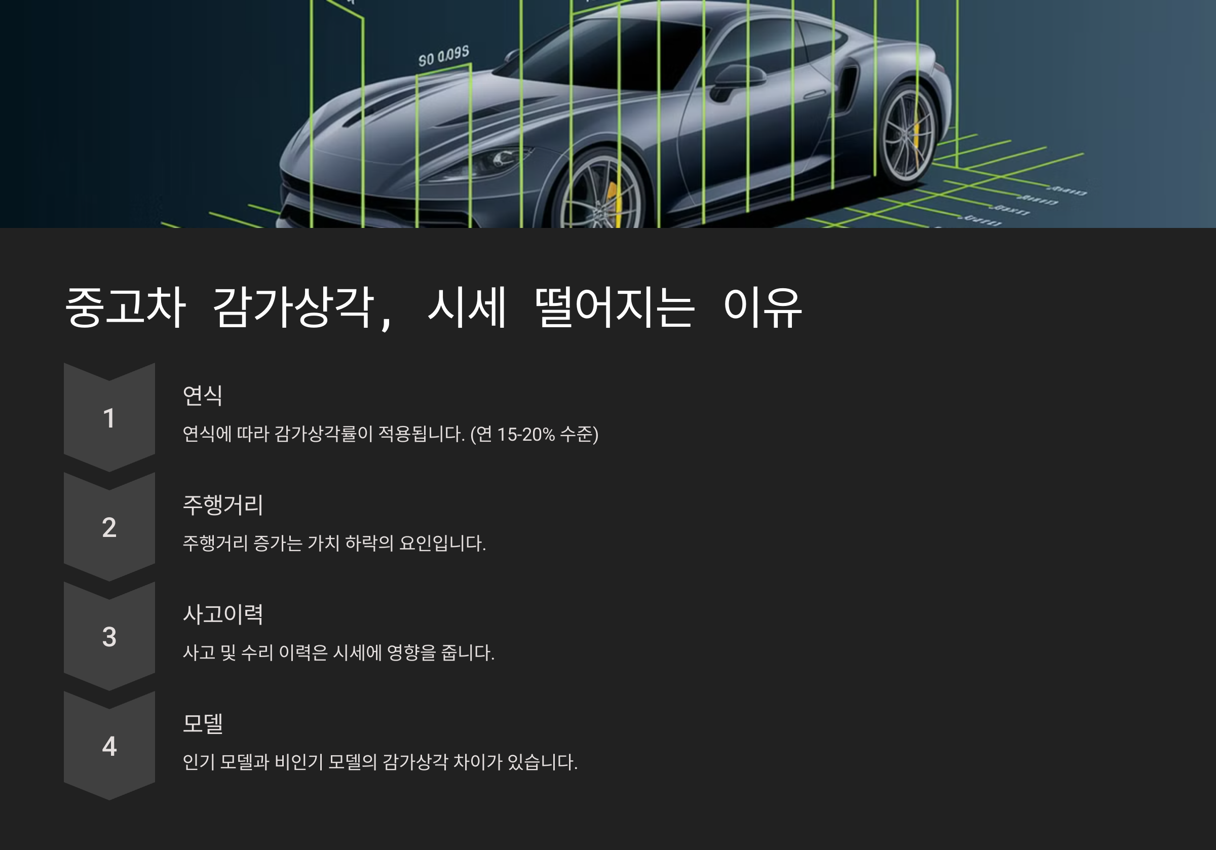 이제 **중고차 감가상각과 시세 하락의 이유**를 알아볼까요? 📉