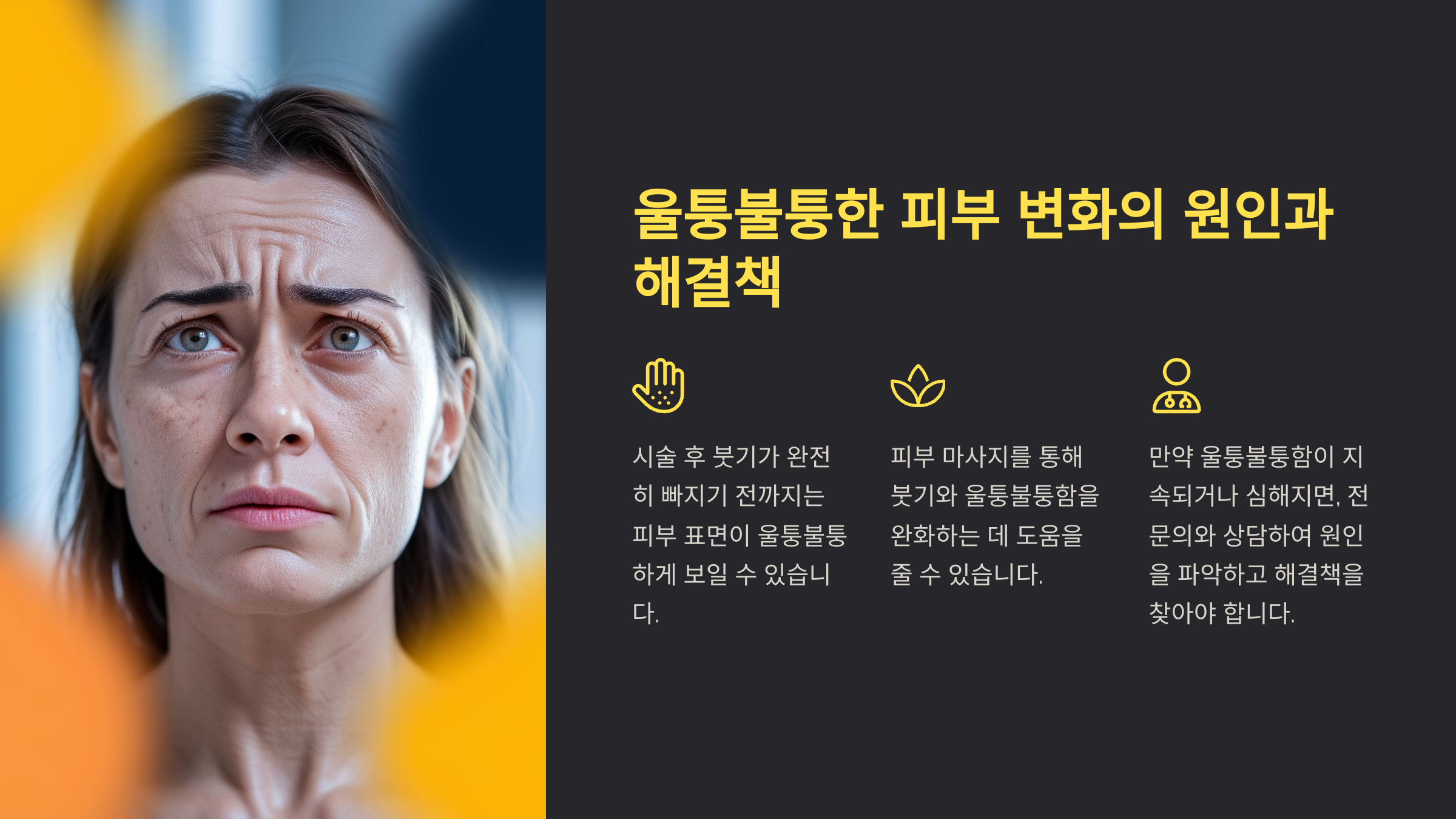 실리프팅 후 피부가 울퉁불퉁해 보일 때가 있어요. 시술 직후에는 붓기나 염증 반응 때문에 표면이 고르지 않을 수 있지만, 시간이 지나면서 점차 자연스러워지는 경우가 많답니다. 하지만 어떤 경우에는 잘못된 실 삽입이나 조직 반응 때문에 울퉁불퉁함이 오래 지속될 수도 있어요. 😥