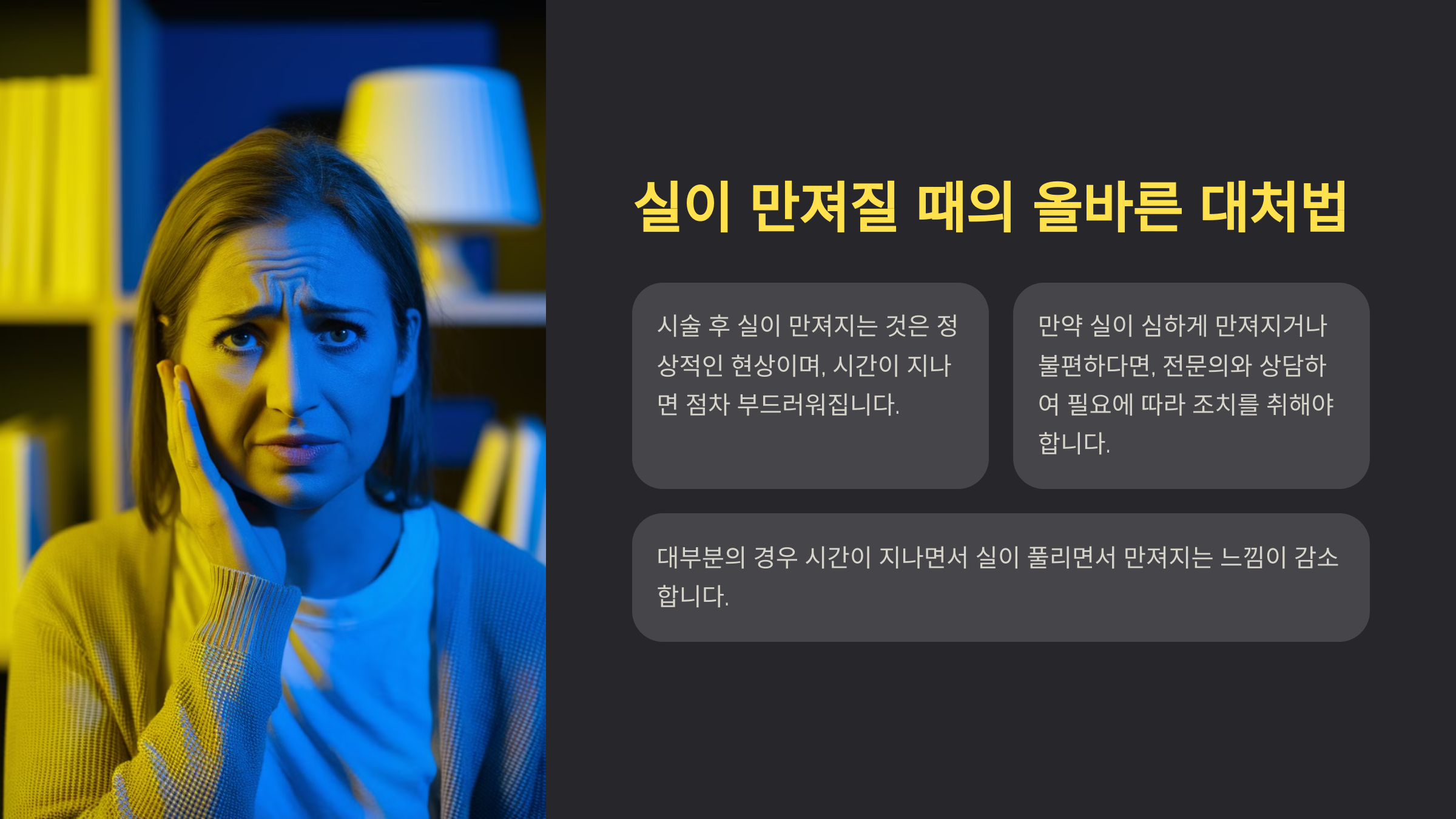 실이 만져진다고 해서 항상 문제가 있는 것은 아니지만, 이상 징후가 있다면 빠르게 병원을 찾아 전문가의 진단을 받는 것이 가장 안전해요. 시술 후 관리만 잘해도 이런 문제를 최소화할 수 있답니다! 😉