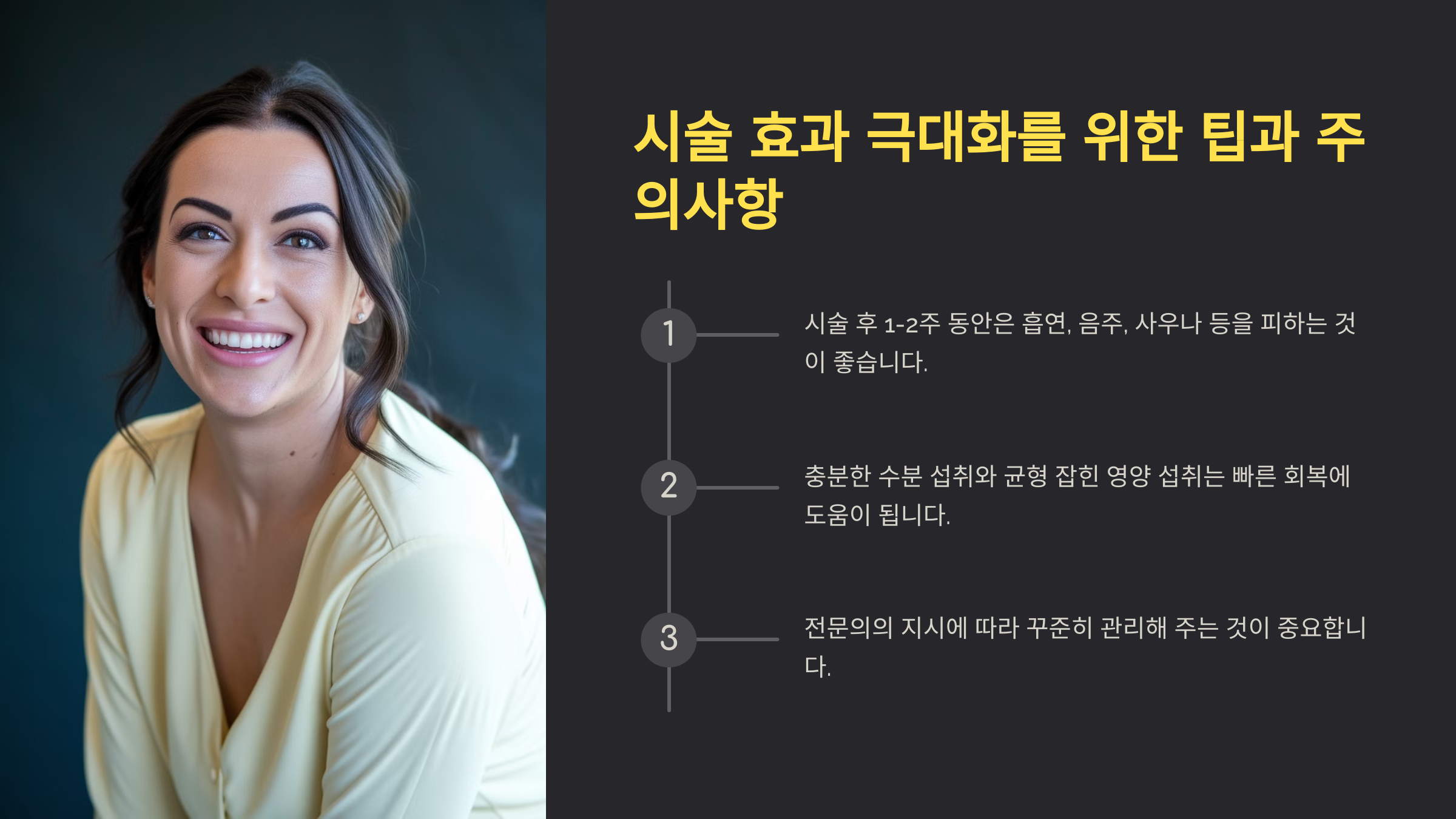 또한, 붓기를 줄이려면 시술 후 48시간 동안은 고개를 숙이거나 무리한 운동을 피하는 게 좋아요. 자극적인 음식이나 술, 담배도 회복을 늦출 수 있으니 조심해야 해요. 충분한 수분 섭취와 숙면도 붓기를 빠르게 가라앉히는 데 도움이 된답니다. 😴