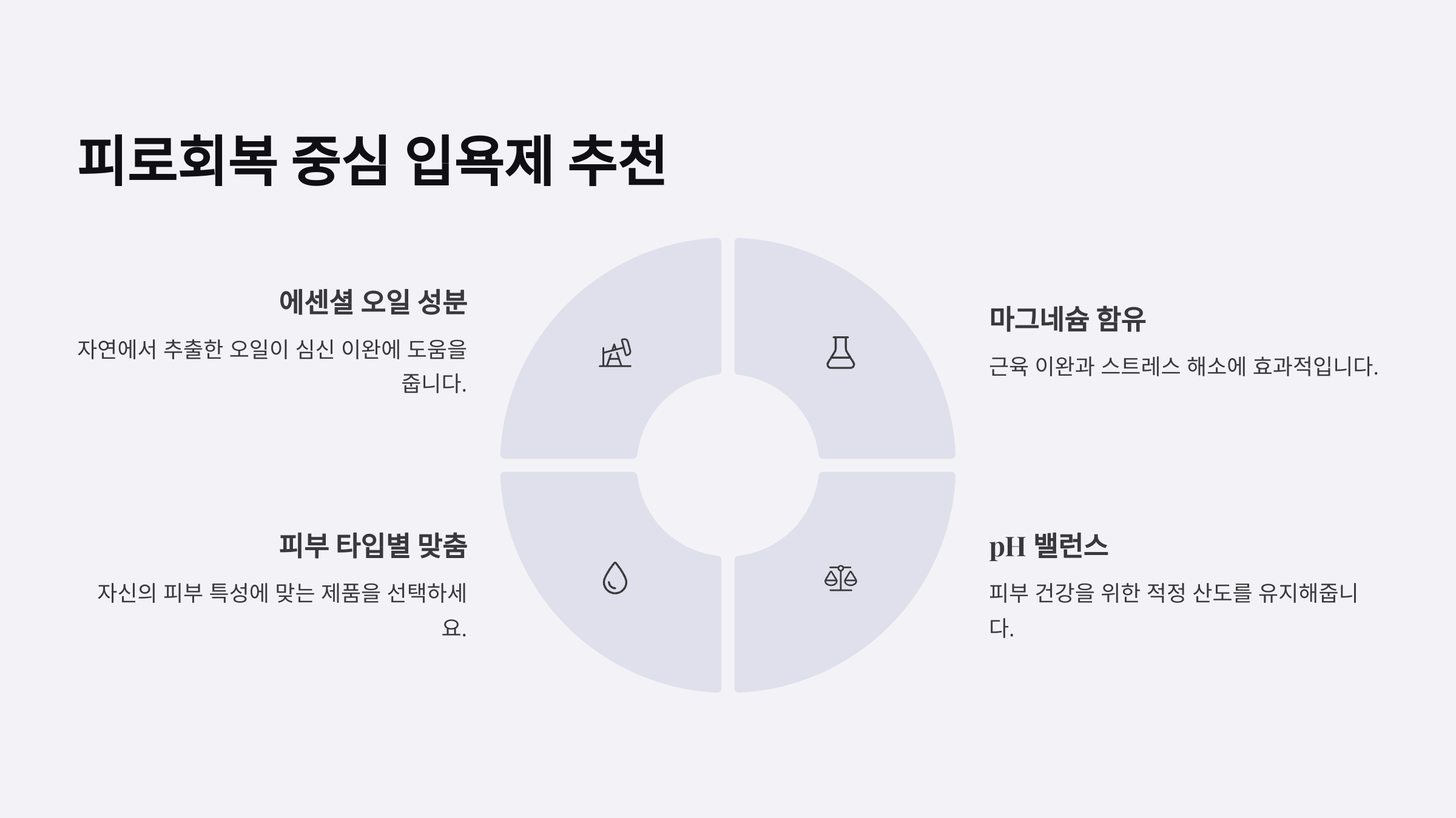 | 입욕제 | 보습, 피로회복 | 라벤더, 시트러스 |
