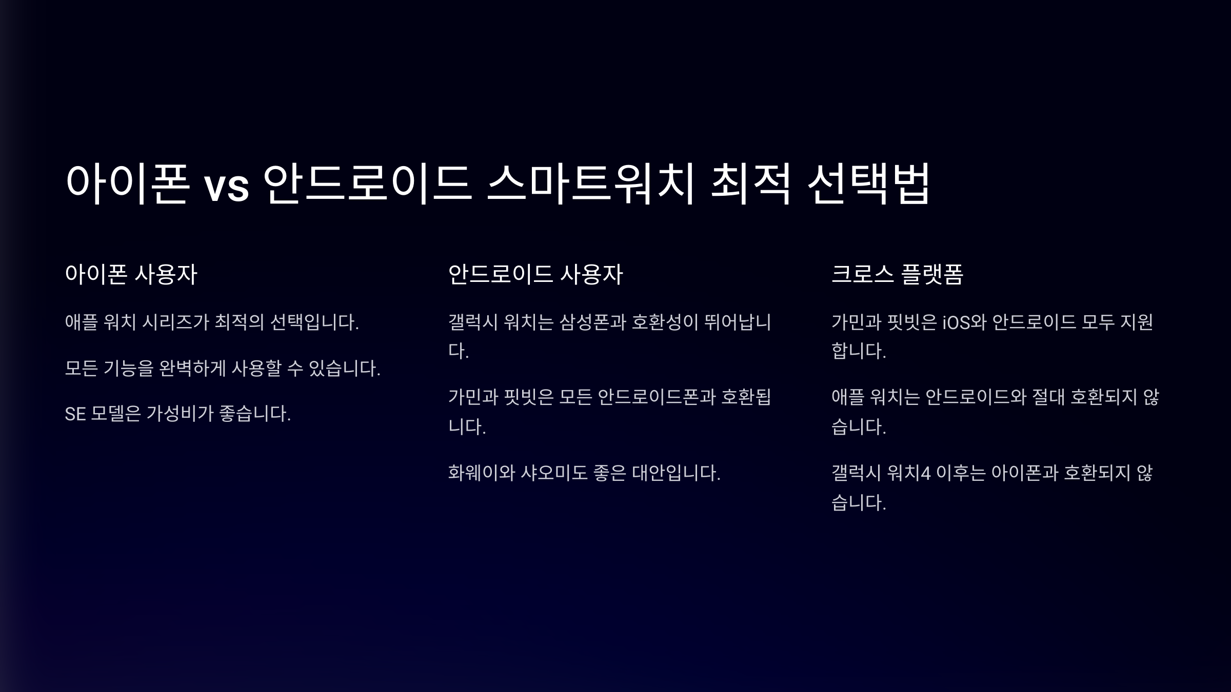 | 추천 스마트워치 | 애플 워치 시리즈 9, 애플 워치 SE | 갤럭시 워치 6, 픽셀 워치 2, 가민 스마트워치 |