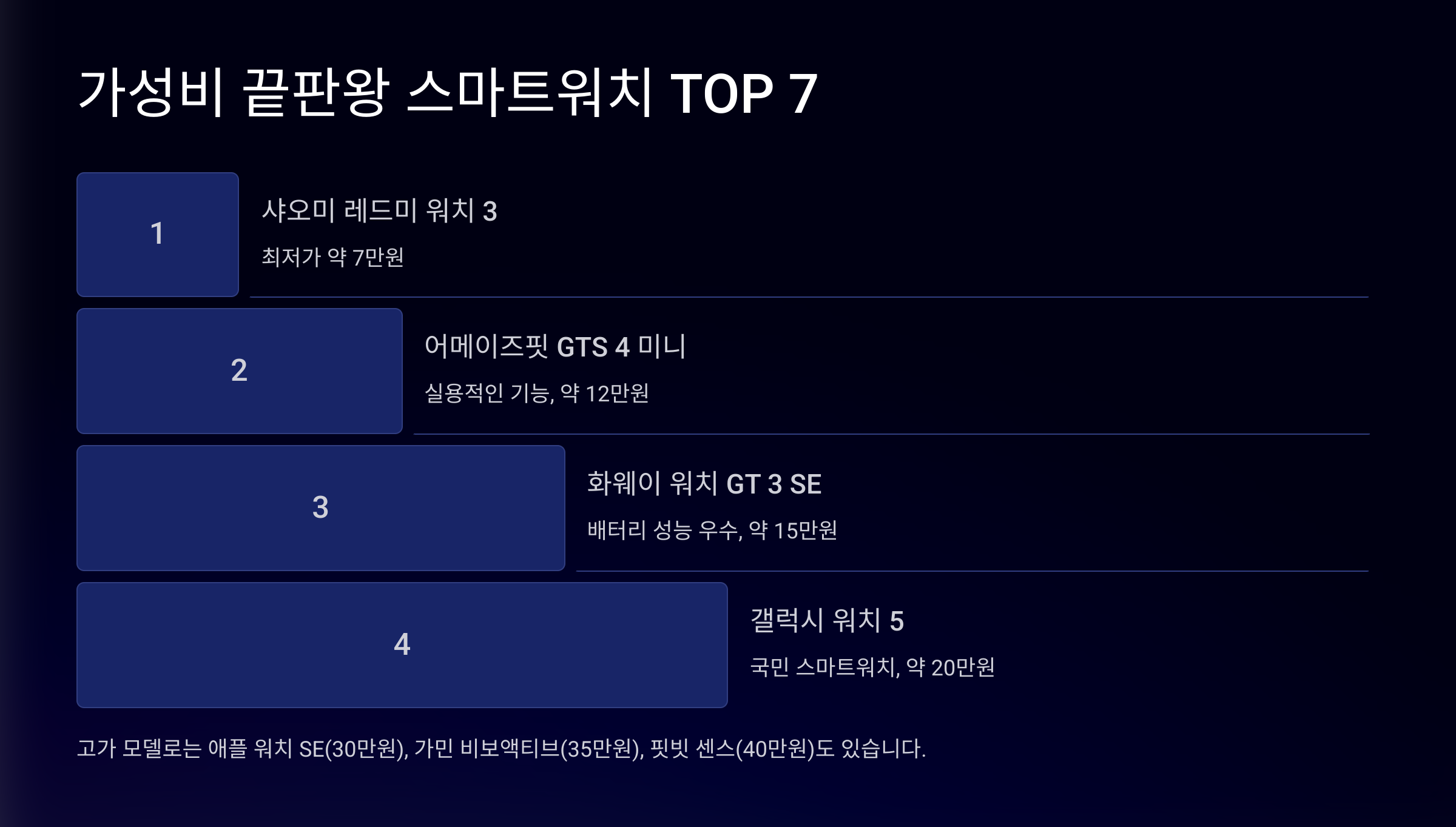 이제 스마트워치를 선택할 때 꼭 확인해야 할 체크리스트를 알았으니, 가성비 끝판왕 스마트워치 TOP 7을 살펴볼까요? 😎