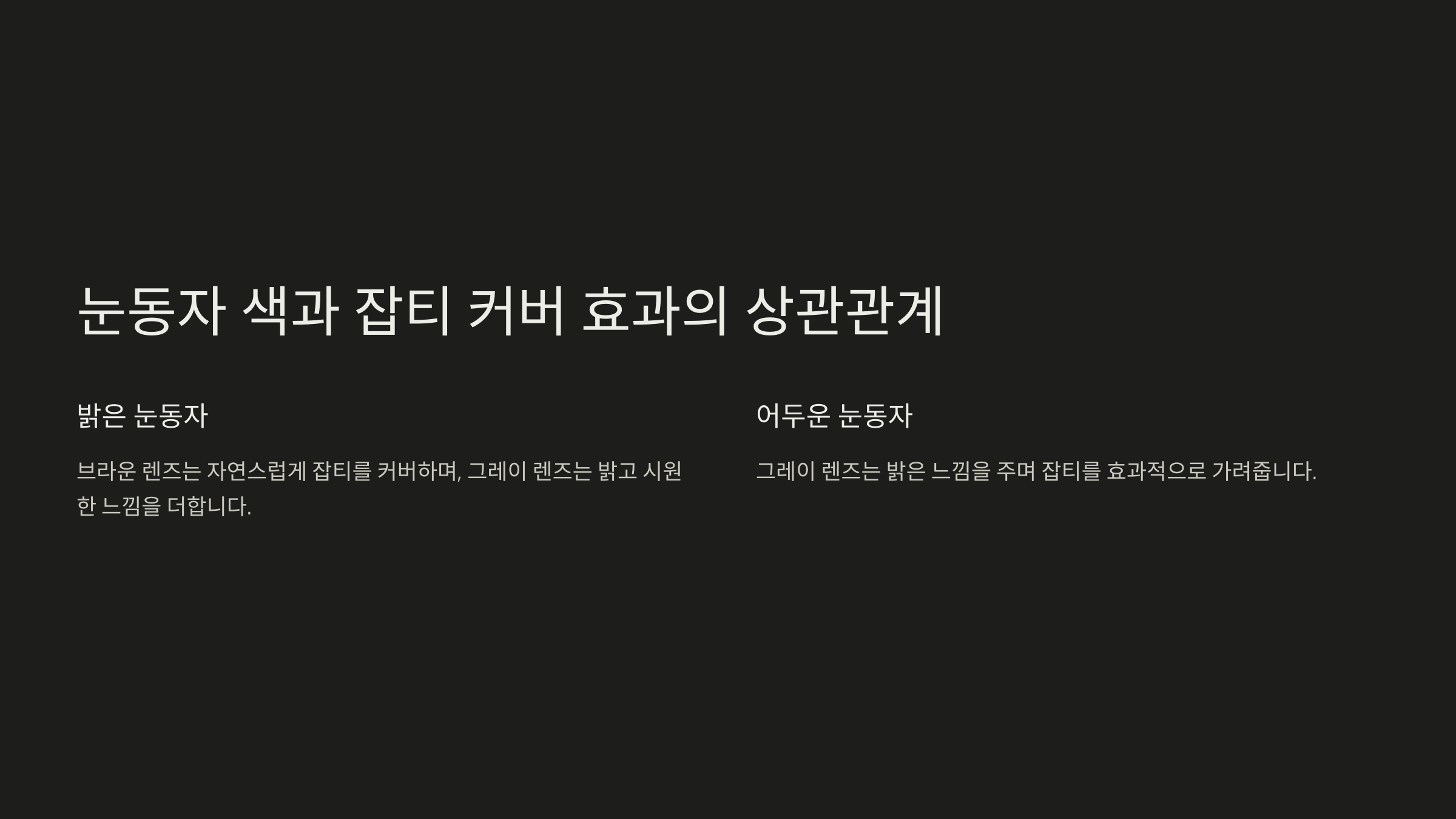 눈동자의 색상에 따라 컬러 렌즈가 피부 톤과 잡티 커버에 미치는 영향이 달라질 수 있어요. 자연 눈동자 색이 짙거나 밝은 경우, 렌즈 컬러 선택 시 주의할 점이 조금 달라요.