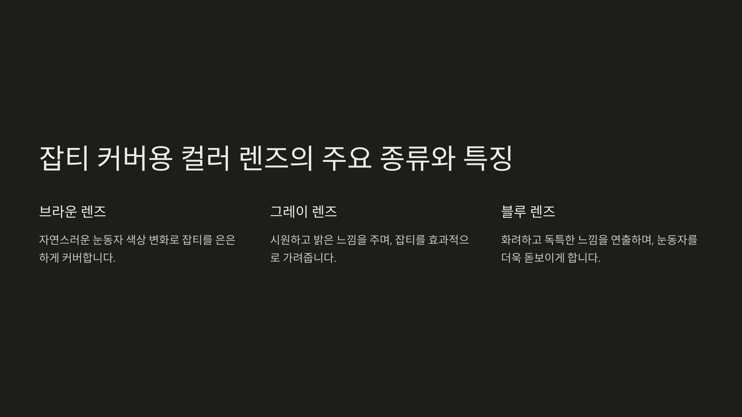 | 렌즈 컬러 | 특징 | 추천 피부 톤 | 잡티 커버 효과 |