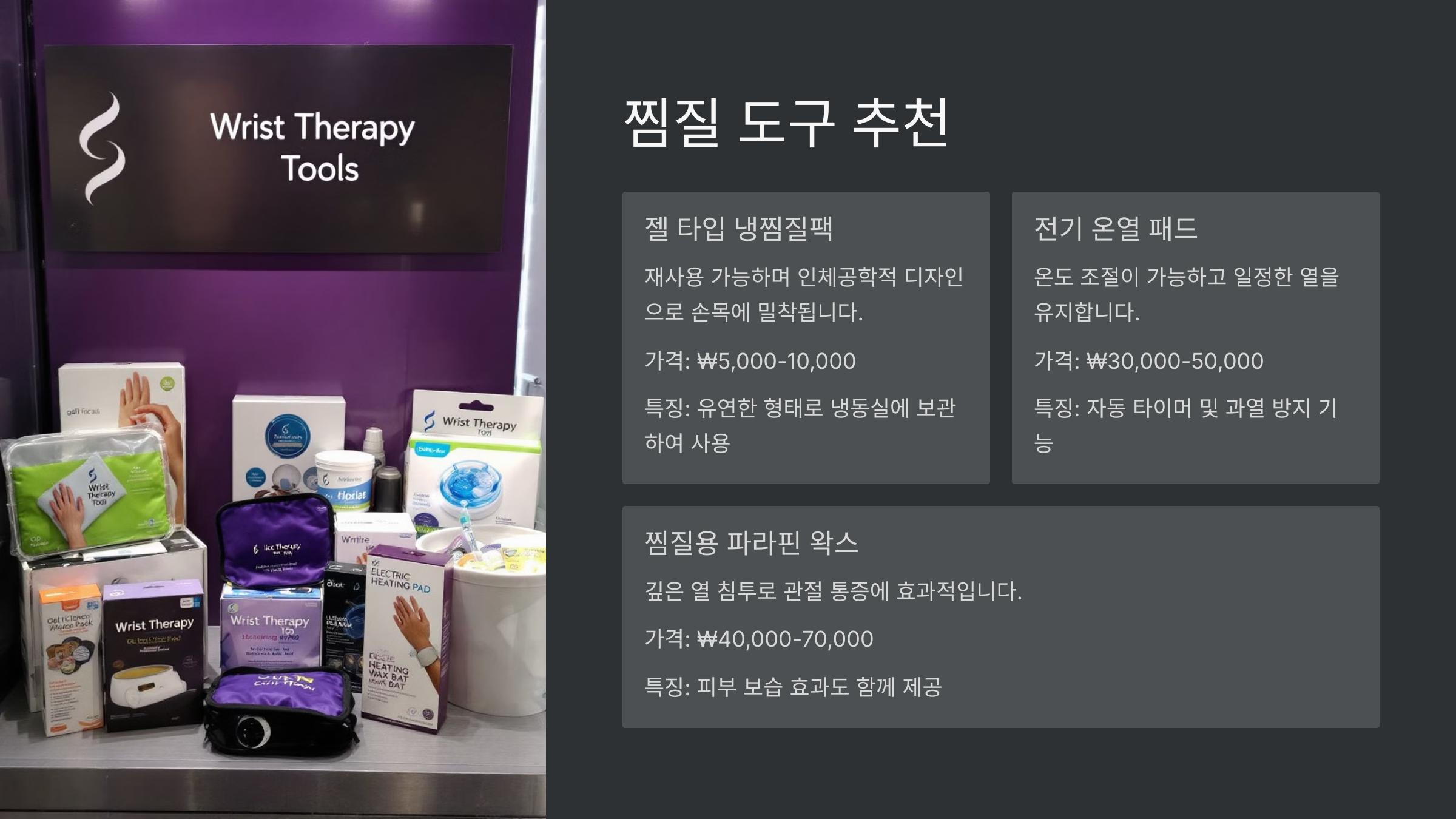 온찜질은 혈액 순환을 촉진하고, 뭉친 근육을 이완시키는 데 탁월한 효과를 보여줘요. 특히 손목이 뻐근하거나, 오래 사용해서 근육이 굳은 느낌이 들 때 아주 좋아요.
