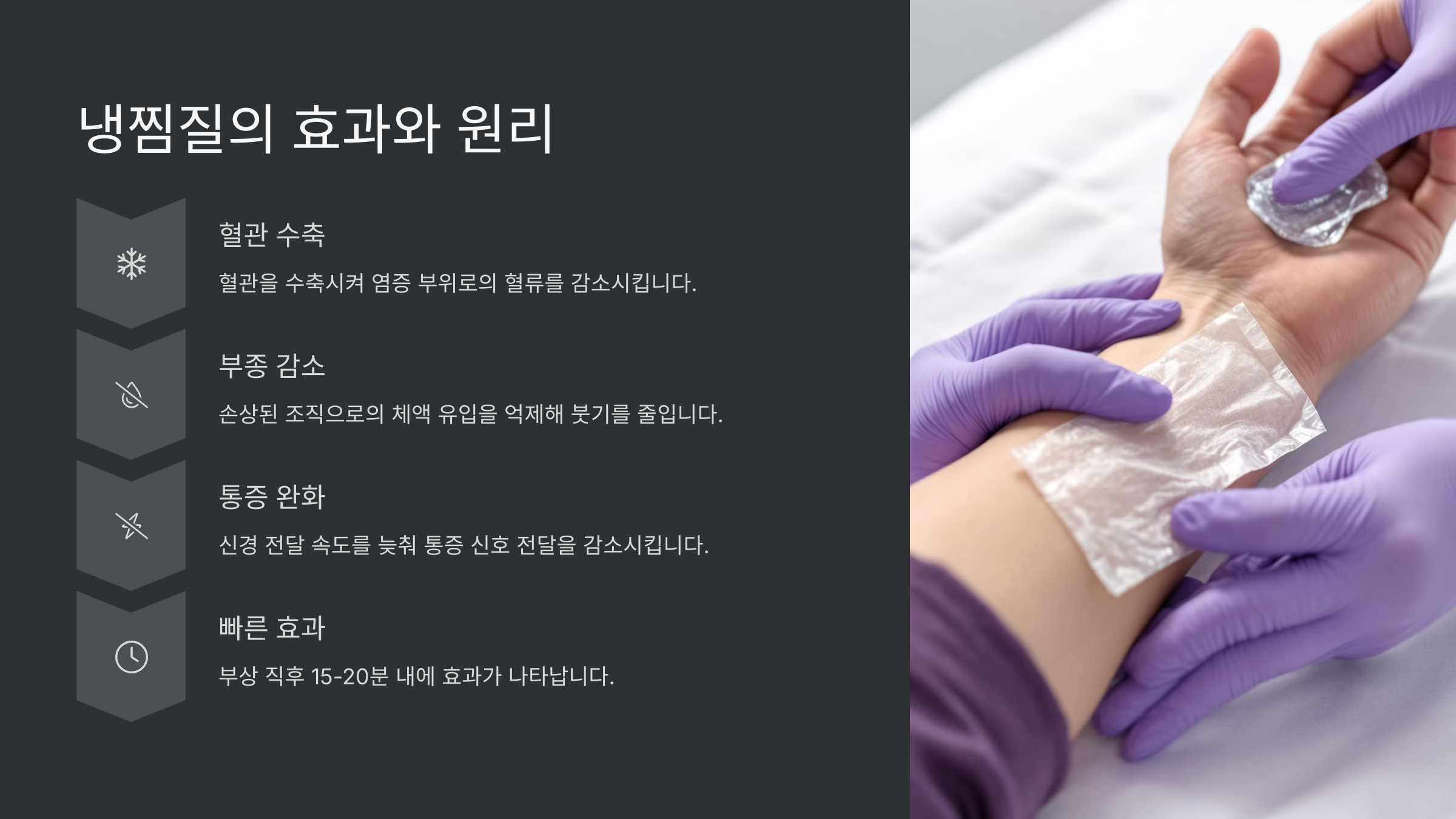 첫째, 냉찜질은 절대 피부에 직접 닿지 않게 해야 해요. 얼음팩을 바로 대면 동상처럼 피부가 얼 수 있어요. 타올이나 거즈를 감싸서 사용하는 건 필수예요.
