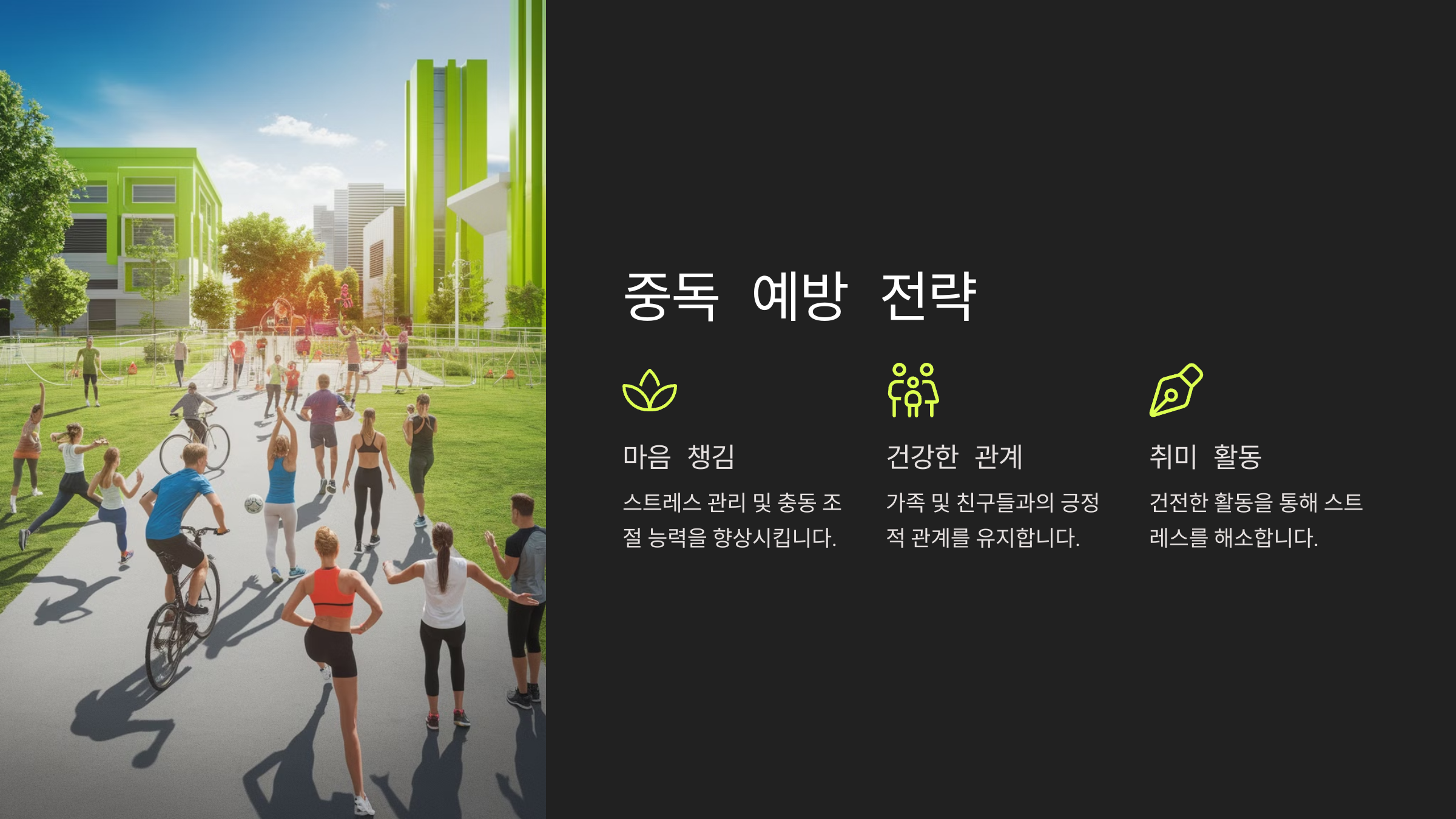 중독은 한 번 빠지면 벗어나기 어렵기 때문에 예방이 무엇보다 중요해요. 건강한 생활 습관을 유지하고, 위험 요소를 조기에 차단하는 것이 가장 효과적인 방법이에요.