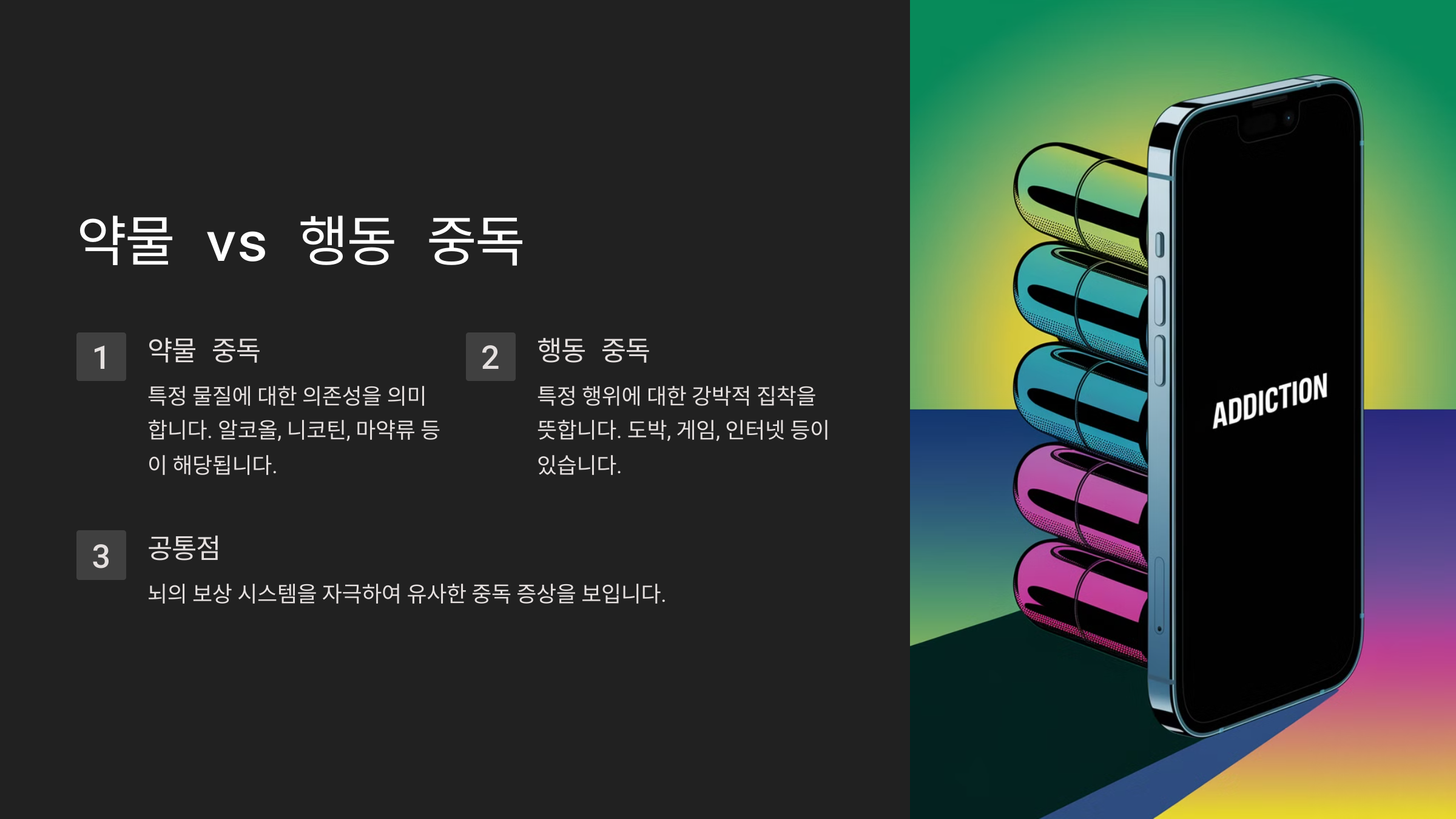 | 원인 | 알코올, 니코틴, 마약 등 화학적 물질 | 도박, 게임, 쇼핑 등 반복적인 행동 |
