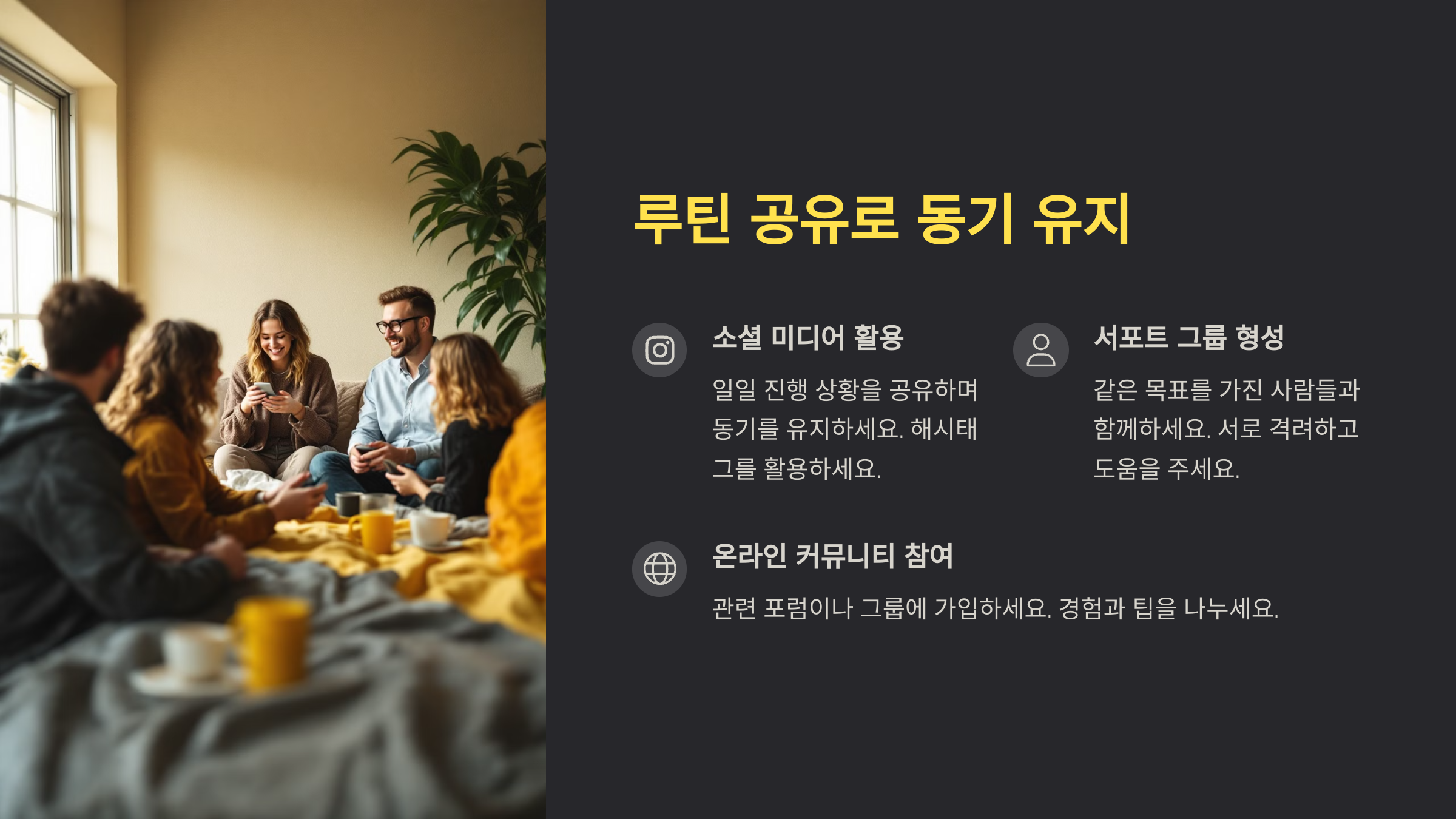 혼자 루틴을 유지하려고 하면 생각보다 빨리 지치기 쉬워요. 이럴 땐 “공유”가 최고의 동기 부여가 될 수 있어요. 내가 뭘 하고 있는지를 누군가와 나누는 순간, 책임감이 생기고 포기할 확률도 확 줄어든답니다.