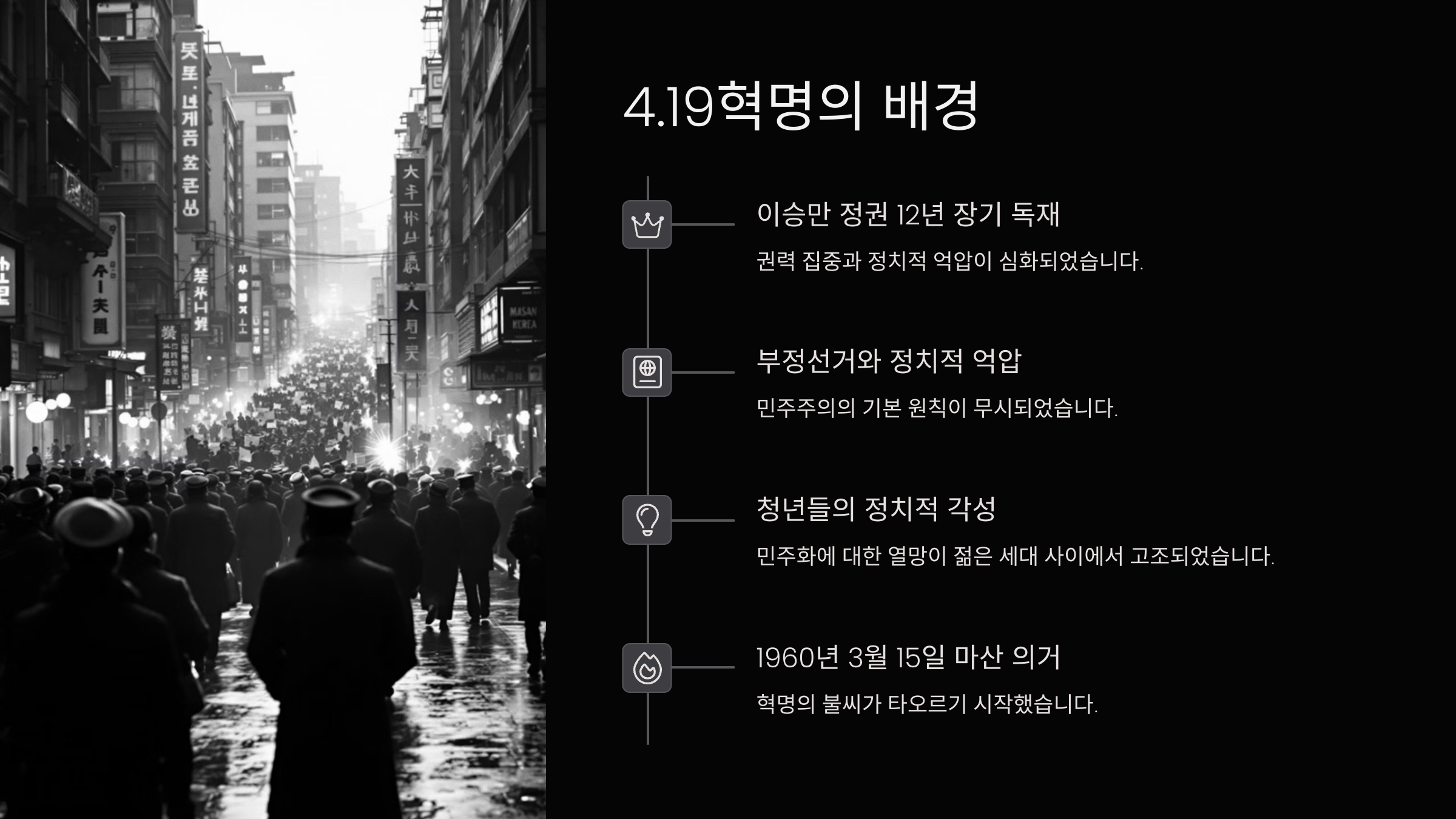 이렇게 4.19혁명은 오랜 불만과 정치적 억압, 경제적 불안, 그리고 극단적인 부정선거가 촉발시킨 ‘국민적 각성’의 결과였다고 할 수 있어요. 이 사건은 단순한 정치 이벤트가 아니라, 대한민국이 민주주의로 나아가게 된 큰 전환점이었어요.